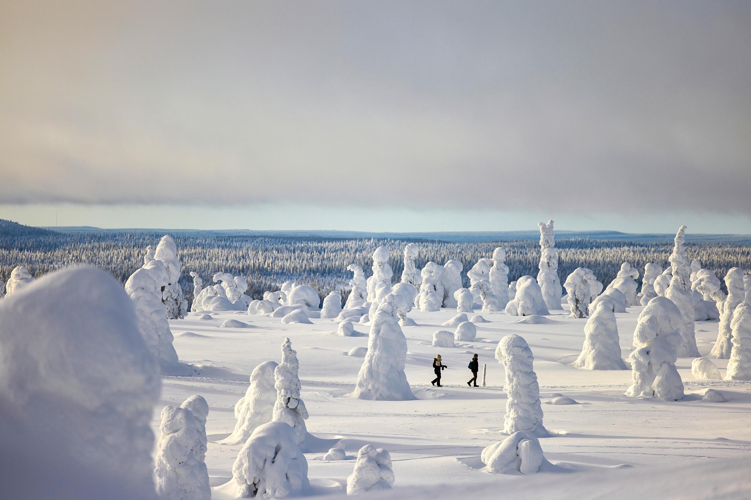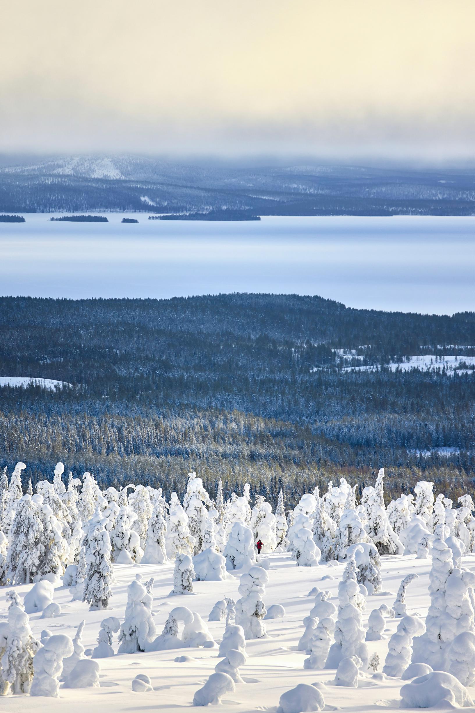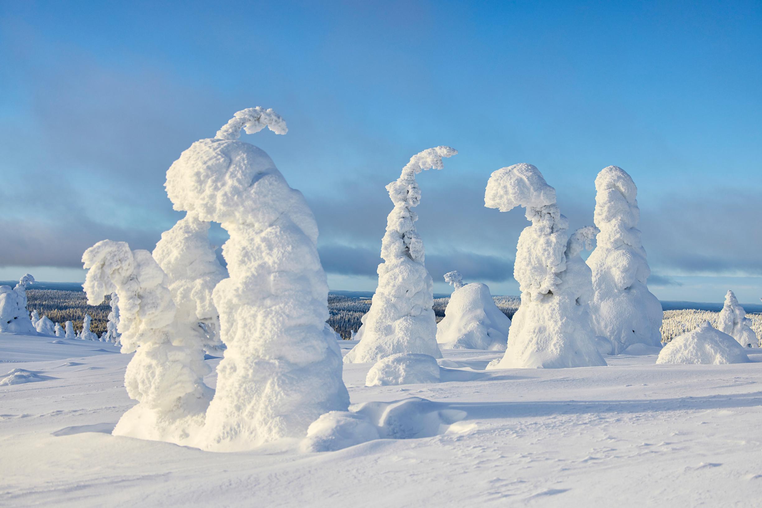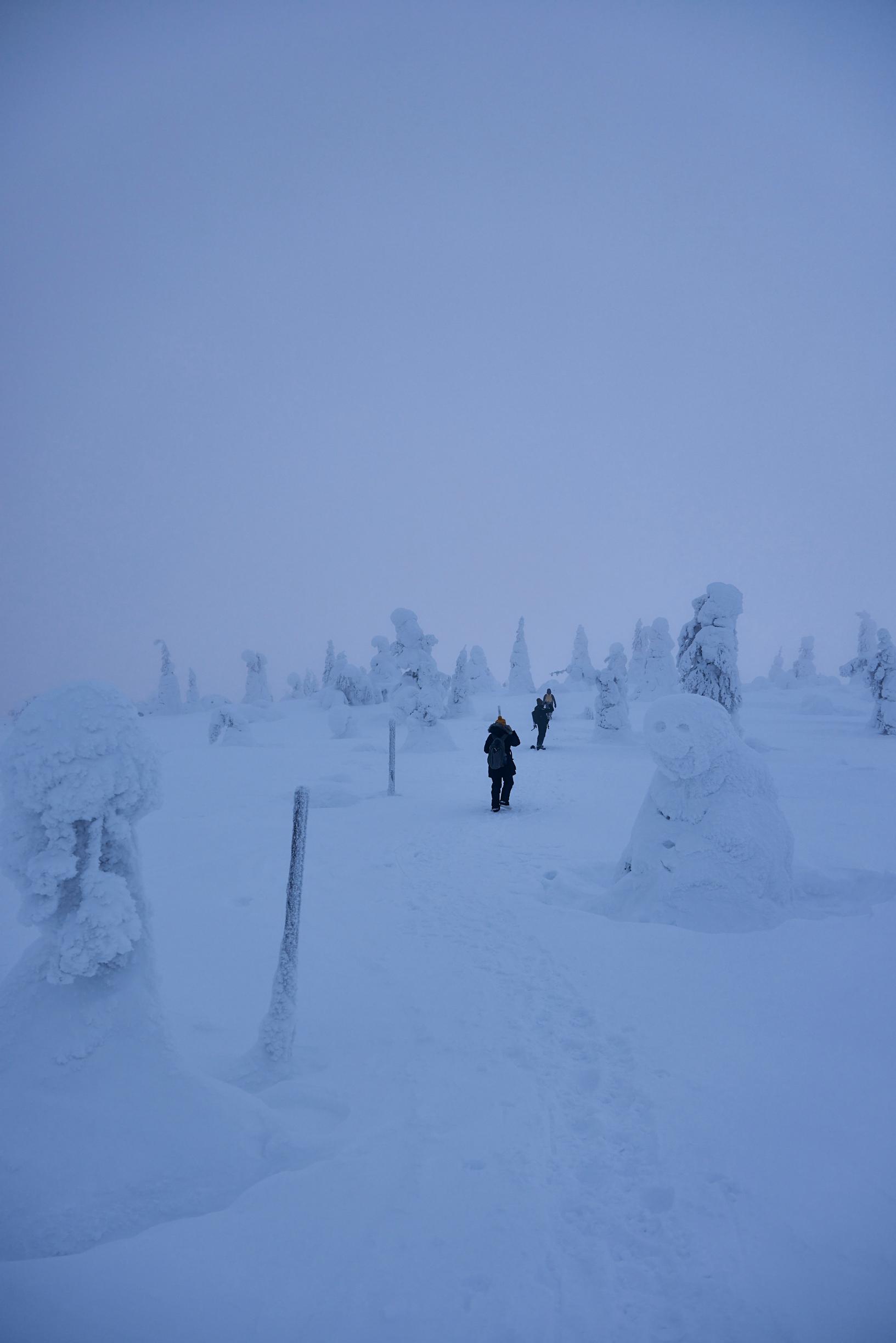 Kovaksi tallattu polku nousee nietosten halki kohti tunturin lakea. Lumi on kuorruttanut ympärillä seisovat kuuset, ja mitä korkeammalle tullaan, sitä paksummaksi lumikerros muuttuu. Pian viimeisetkin havunvihreän sävyt katoavat. On vain paksuja lumipylväitä, joiden sisälle puut ovat jääneet vangiksi.