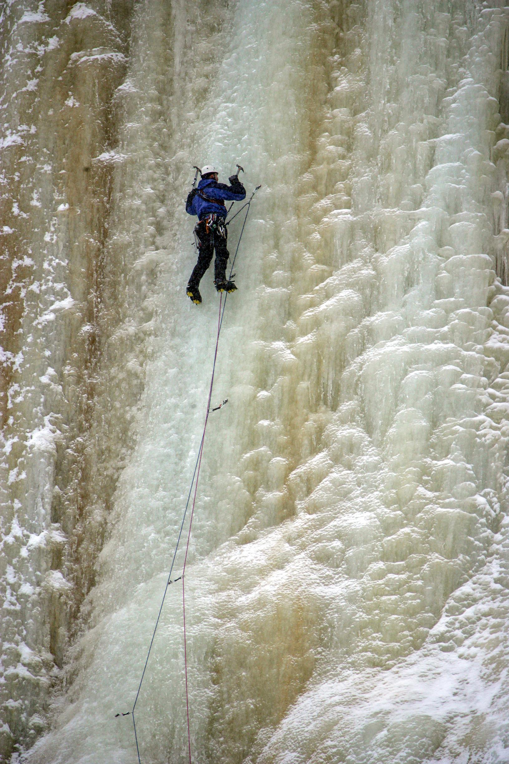 Tämä on Korouoman suosituimpia jääkiipeilypaikkoja, mutta yhtään kiipeilijää ei tänään näy. Heistä muistuttavat vain putouksen pinnassa olevat pienet kolot, jotka näyttävät siltä kuin tikka olisi käynyt nakuttelemassa jäätä.