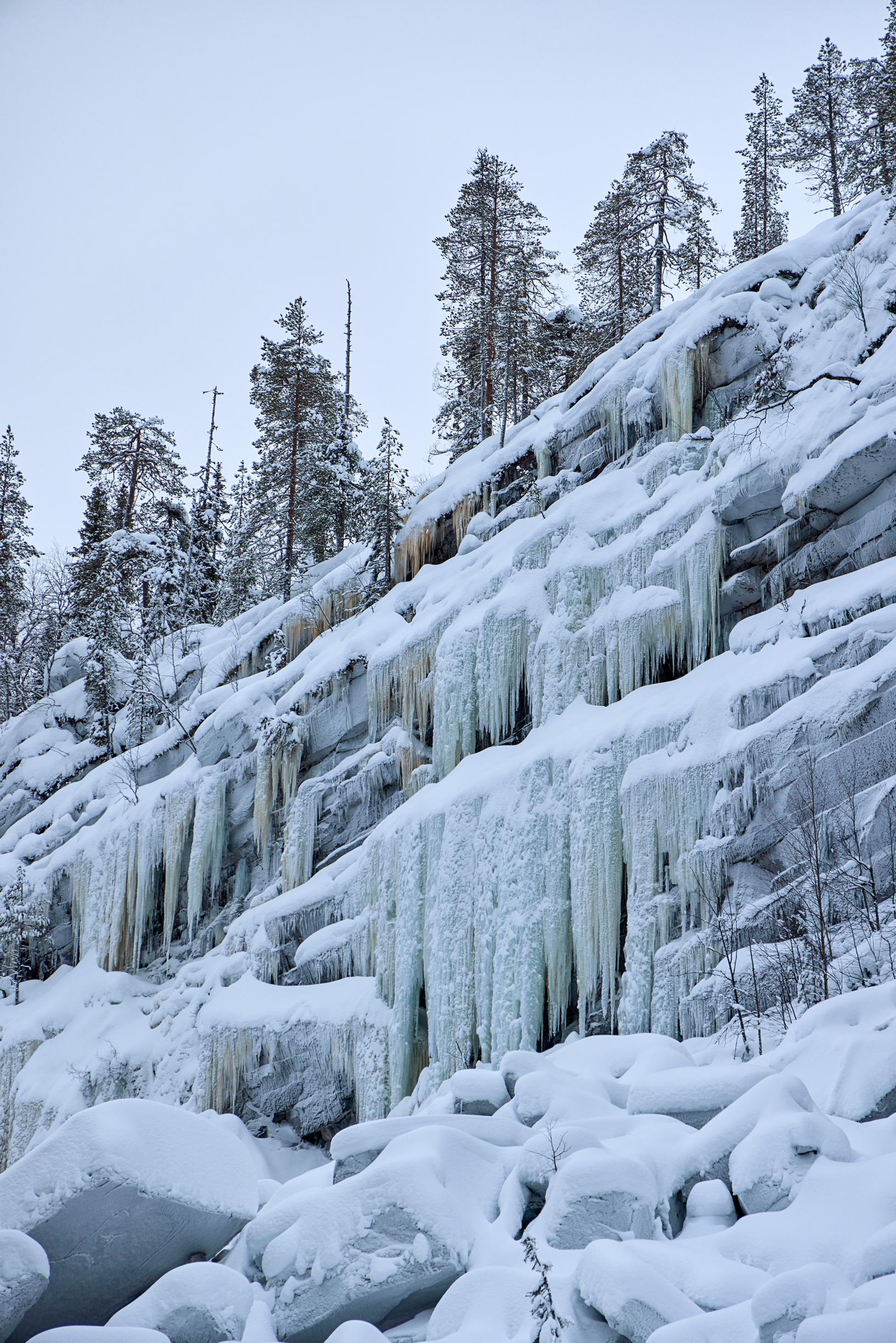 Täältäkö Tapio Wirkkala sai inspiraationsa Ultima Thule -astioihin? Useita metrejä pitkät jääpuikot laskeutuvat portaittain alas tummalta kalliolta ja muodostavat veistoksellisen kokonaisuuden, joka tuo mieleen kotimaisen lasitaiteen klassikot.