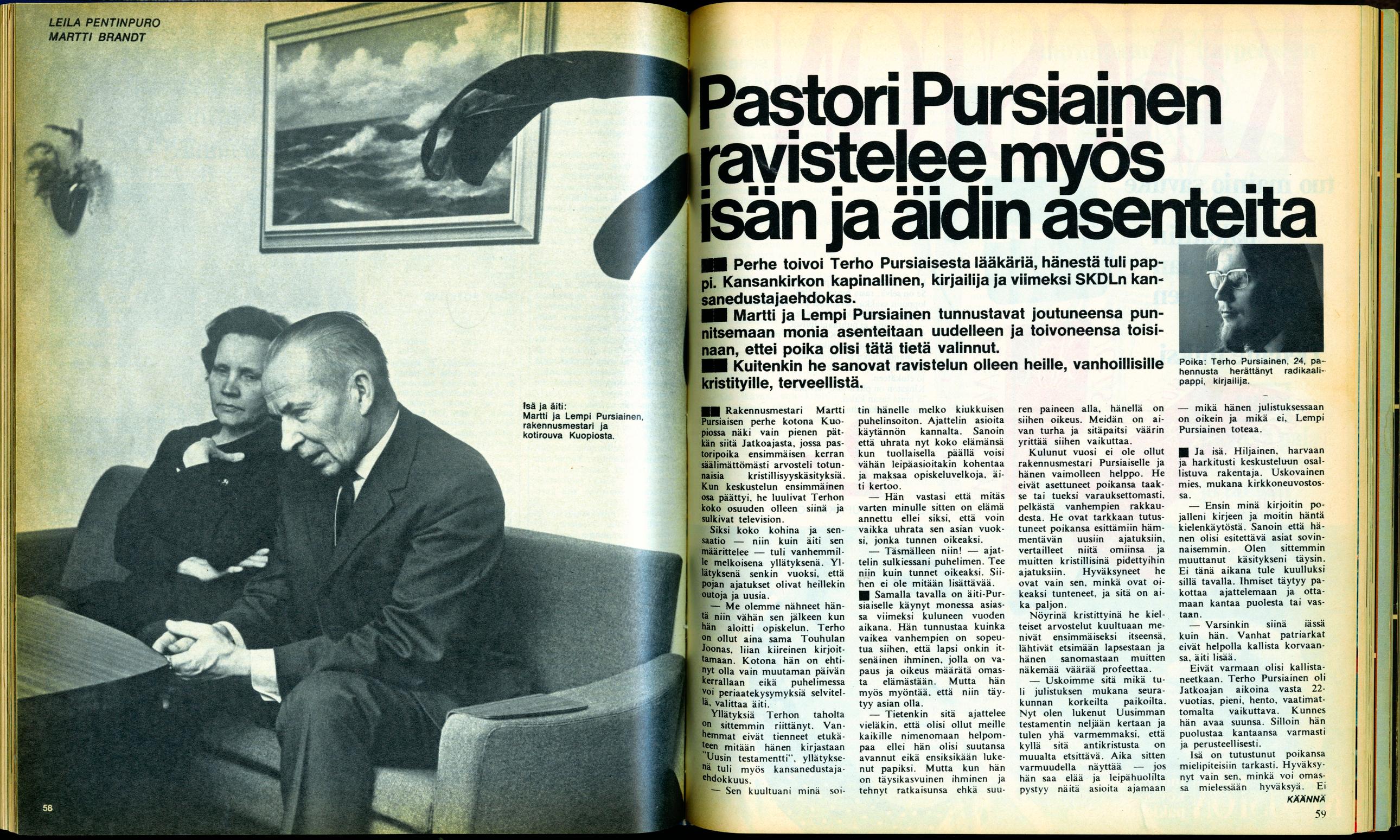 Avun arkistoista löytyykin juttuja Pursiaisesta. Vuonna 1970 haastateltiin 24-vuotiaan Terho Pursiaisen vanhempia, syvästi uskovaisia kuopiolaisia demareita. Vanhemmat sanoivat jutussa, etteivät he voi allekirjoittaa kaikkia poikansa ajatuksia. Lempi-äiti kertoo soittaneensa pojalle kiukkuisena kirjan jälkeen.