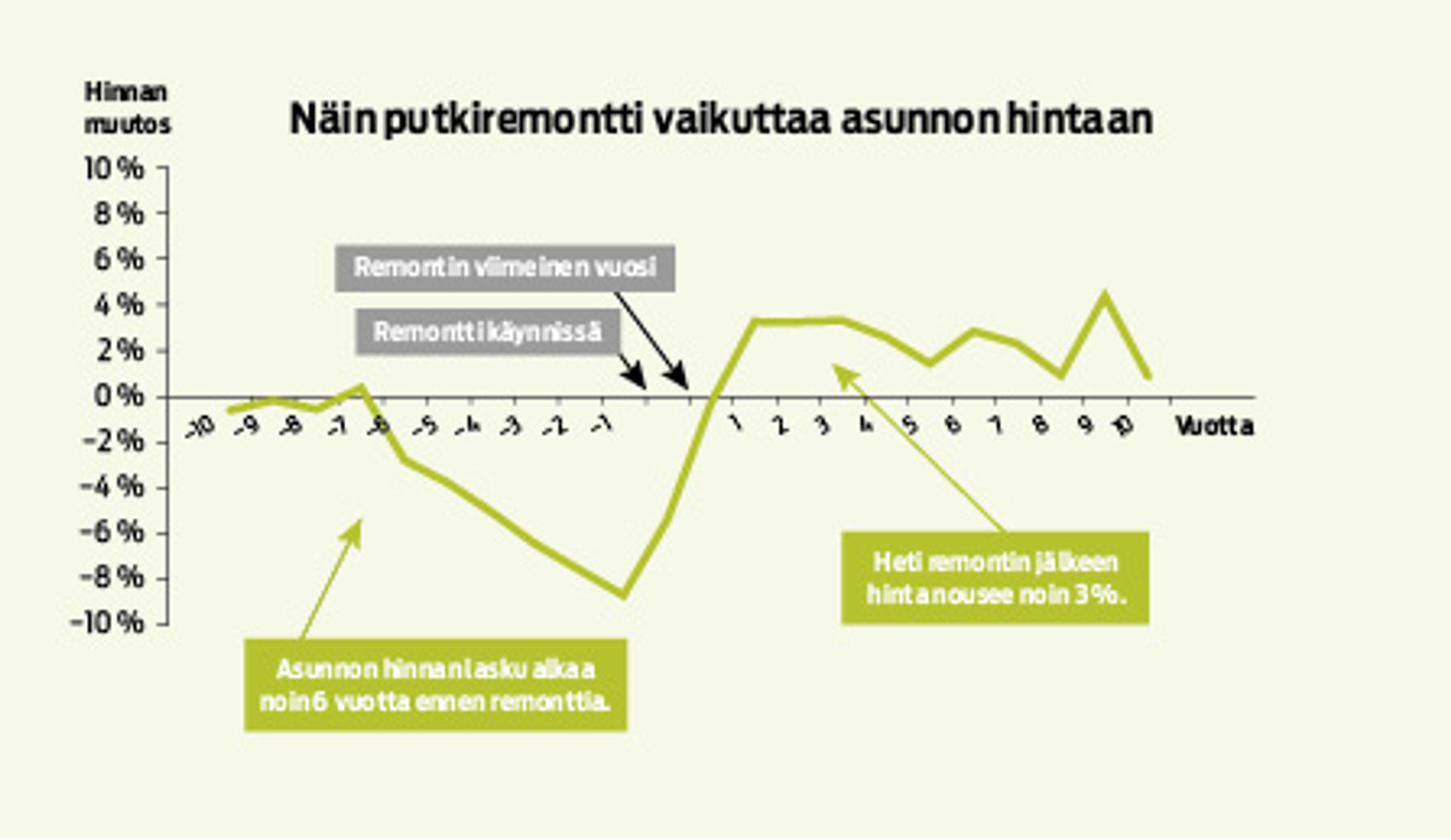 – Jos ostaa halvalta, noin 2 000 euron neliöhinnan alueelta, neliöhinta ei nouse putkiremontin kuluja vastaavasti. Jos ostaa asunnon vuotta ennen putkiremonttia ja myy vuosi sen jälkeen, jää varmasti tappiolle ja kaiken ohessa on joutunut asumaan remonttiasunnossa.