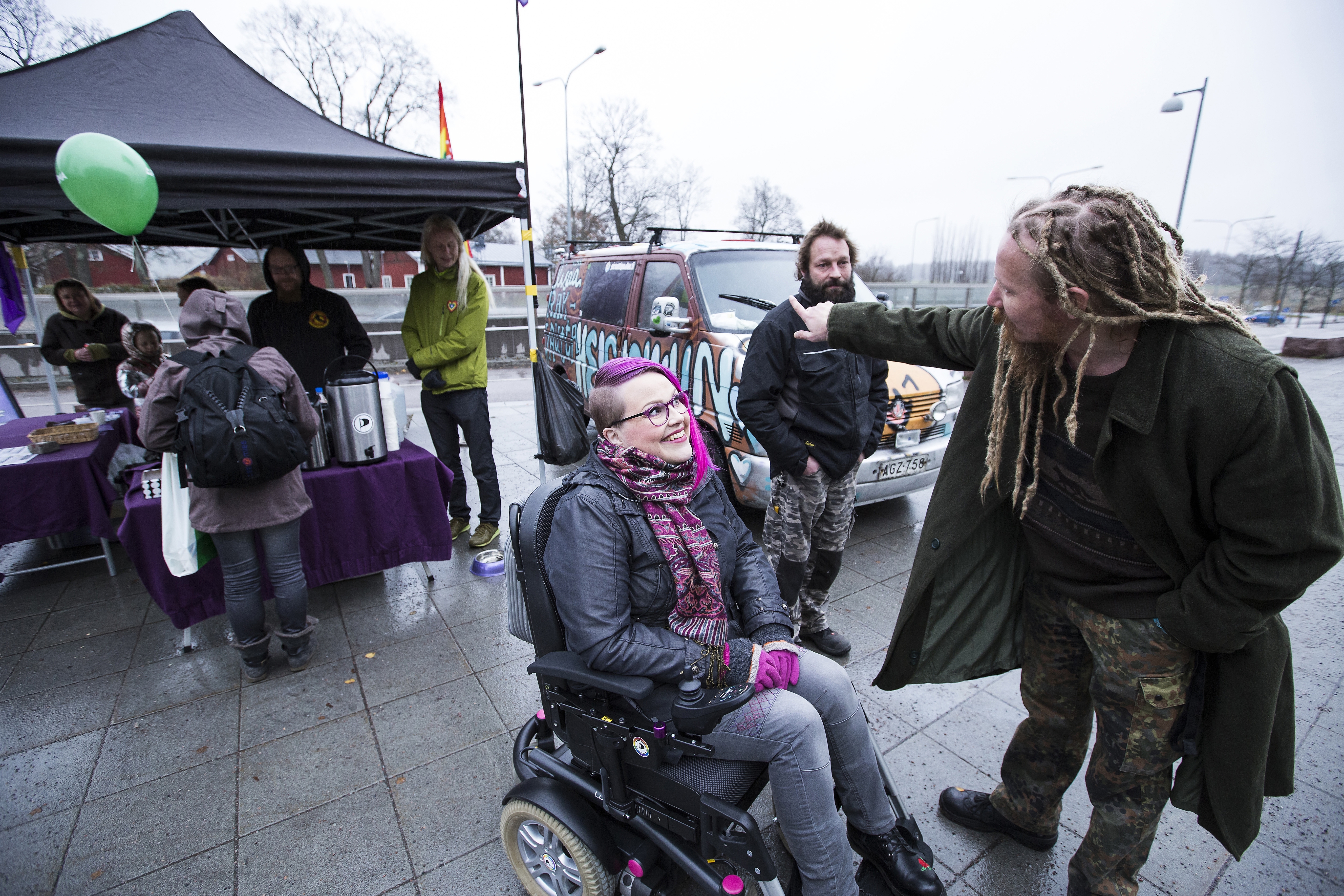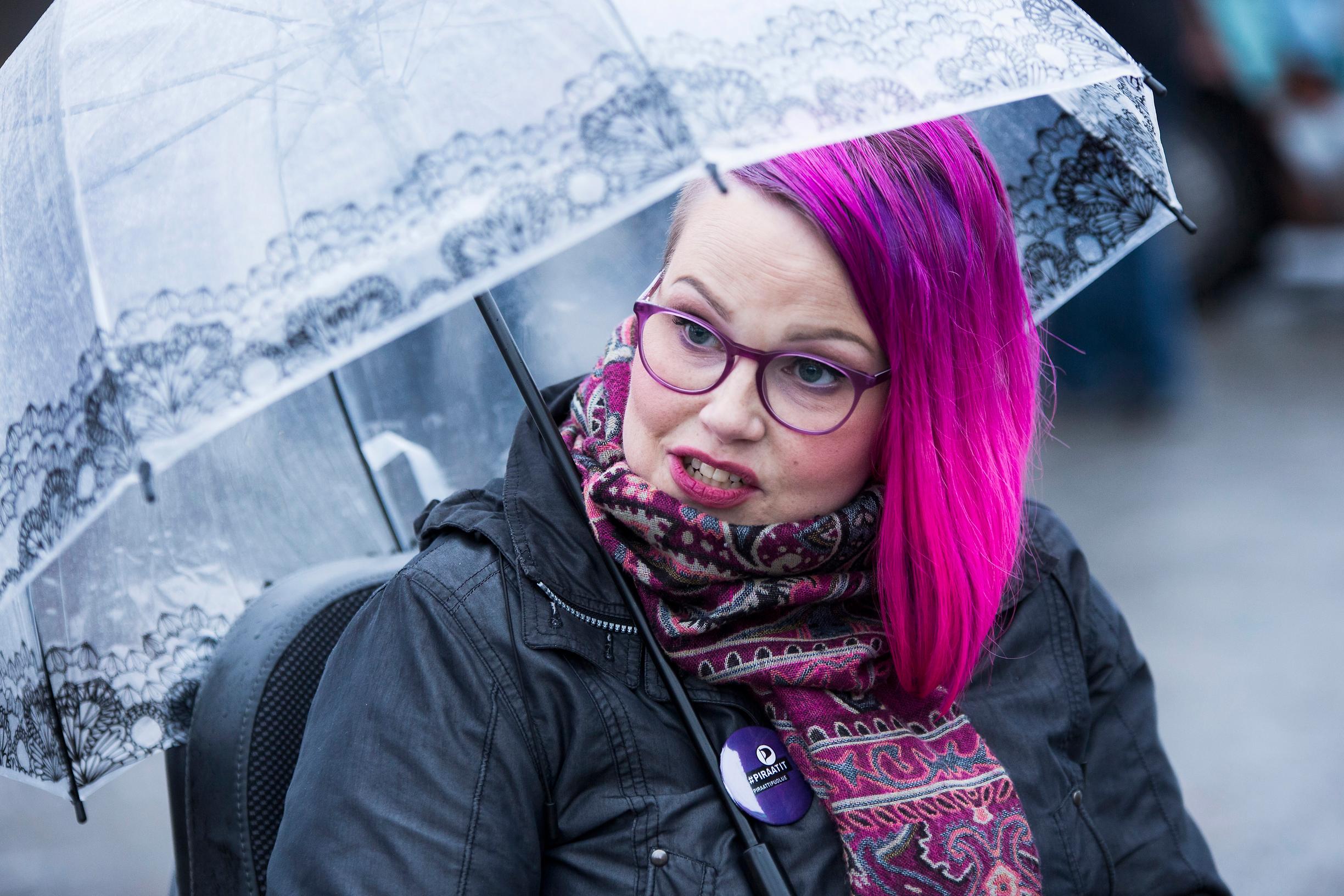 Riikka Nieminen, 38, suristaa ihmisten luo sähköpyörätuolillaan. Hän on Piraattipuolueen Uudenmaan piiriyhdistyksen puheenjohtaja ja kevään 2019 kansanedustajaehdokas. Niemisen asusteet ja hiukset ovat sävy sävyyn Piraattien violetin tunnusvärin kanssa.