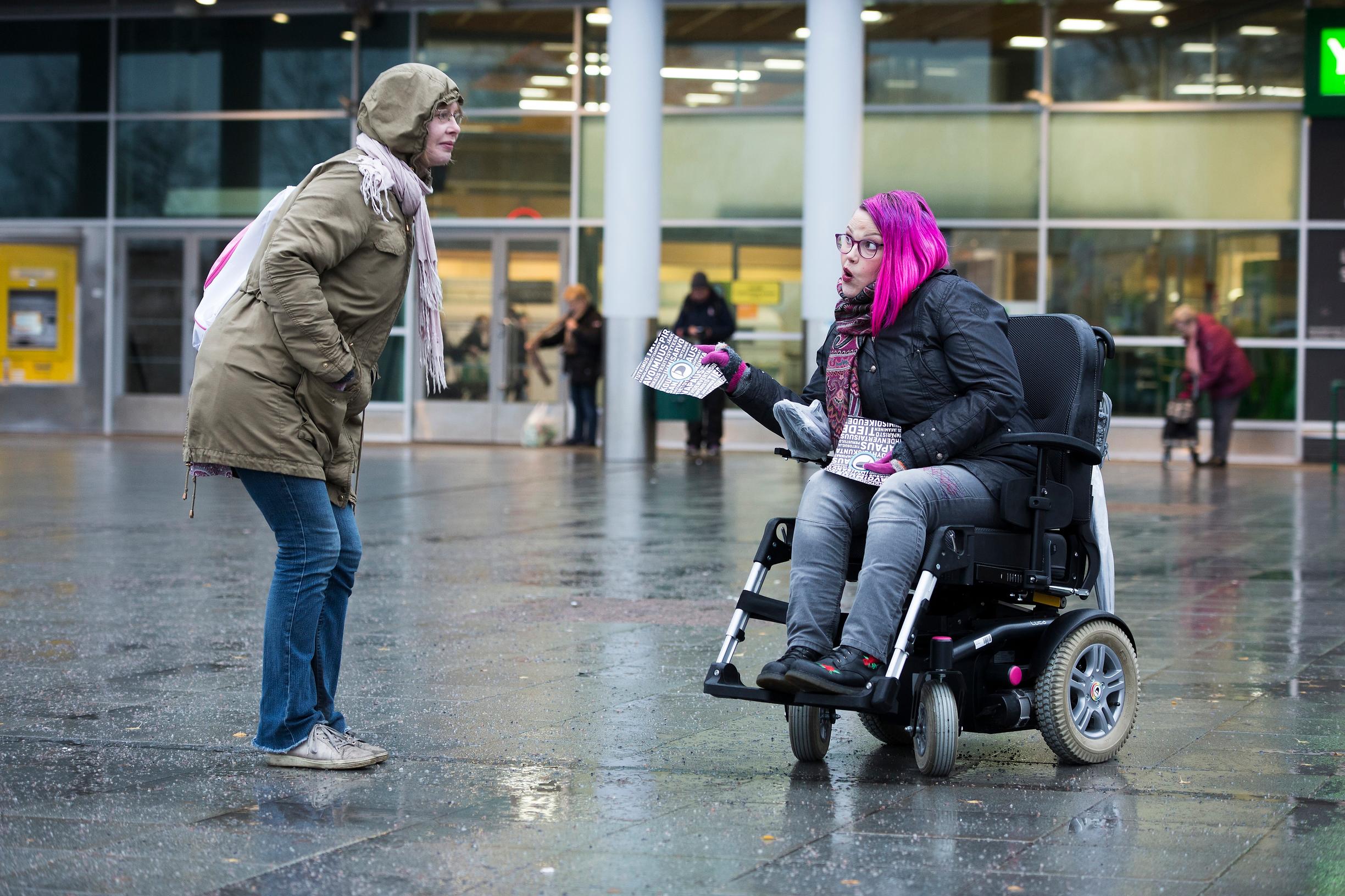 Hän lähestyy ihmisiä torilla vesisateessa, koska hän toivoo muutosta. Kenenkään ihmisarvoa ei pitäisi vähätellä taustan, sairauden tai vamman vuoksi.