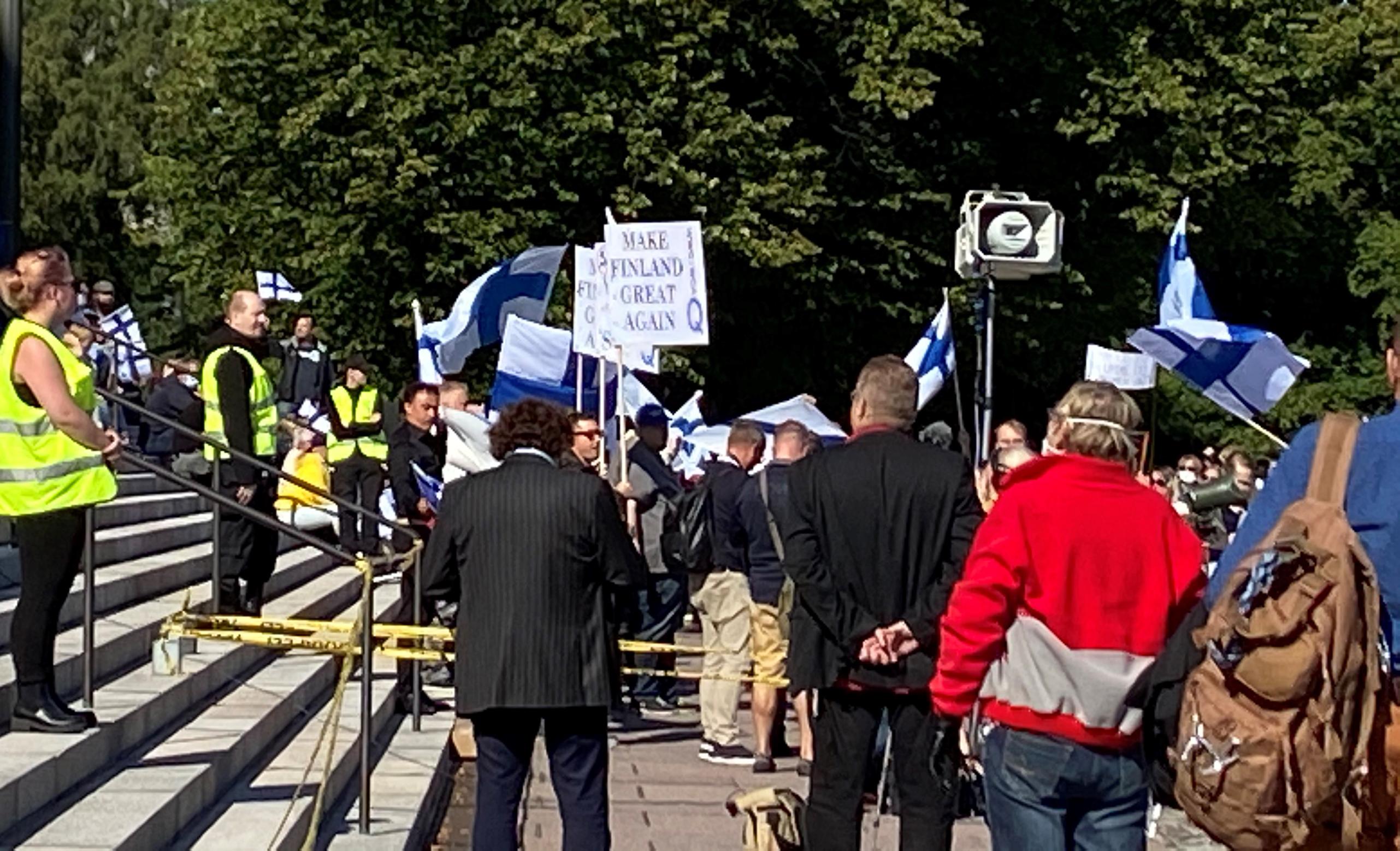 Eduskuntatalon edessä Helsingissä järjestettiin 1. syyskuuta EU-vastainen mielenosoitus. Eräs osallistuja kantoi mielenosoituksessa kylttiä, jossa luki Make Finland Great Again. Virkkeen perässä oli Q-kirjain.