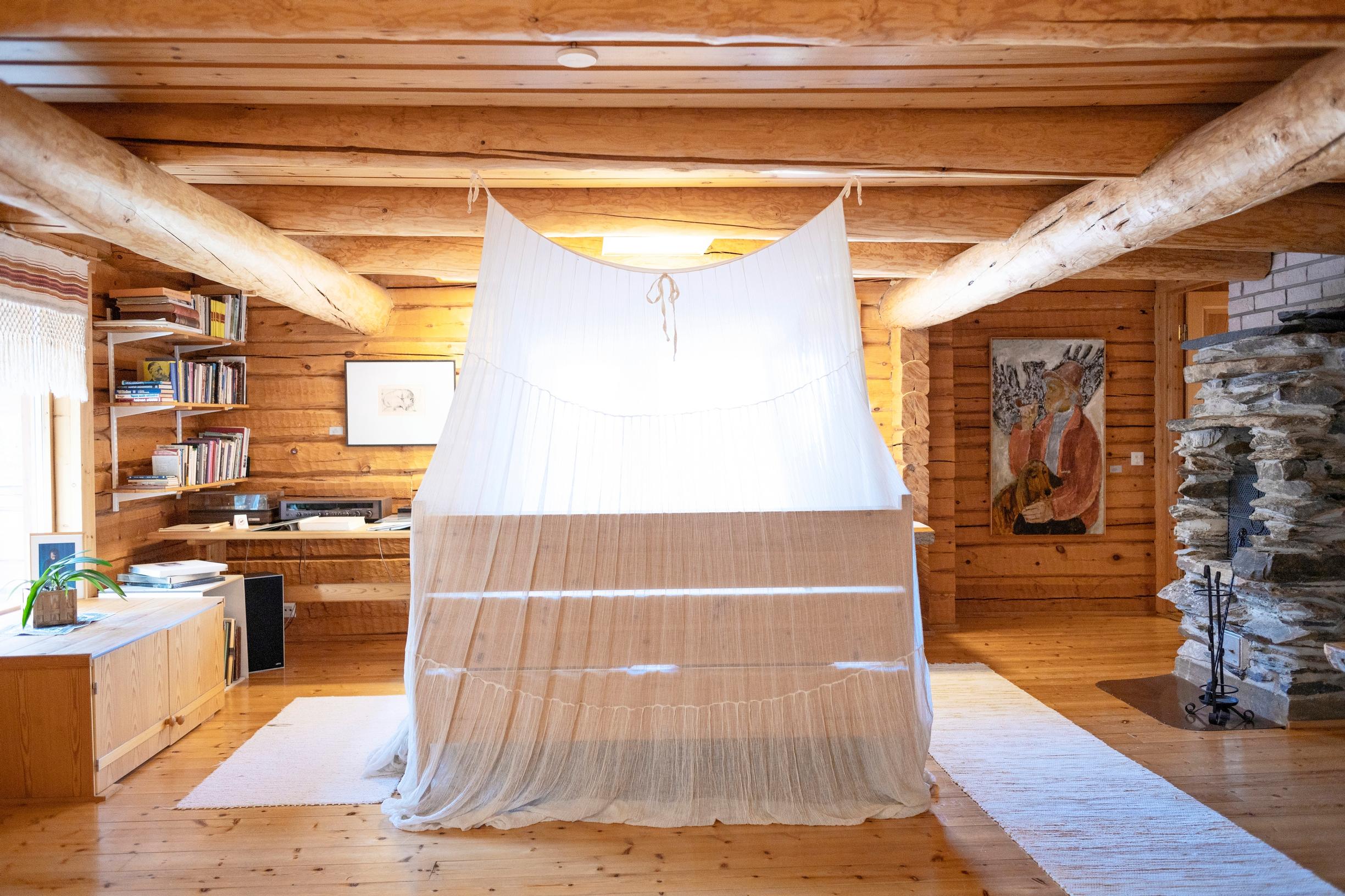 Taiteilijan oman sängyn lisäksi ateljeekodin yläkerrassa on lehmäntaljalla peitelty sänky hänen viimeiseksi jääneelle koiralleen.