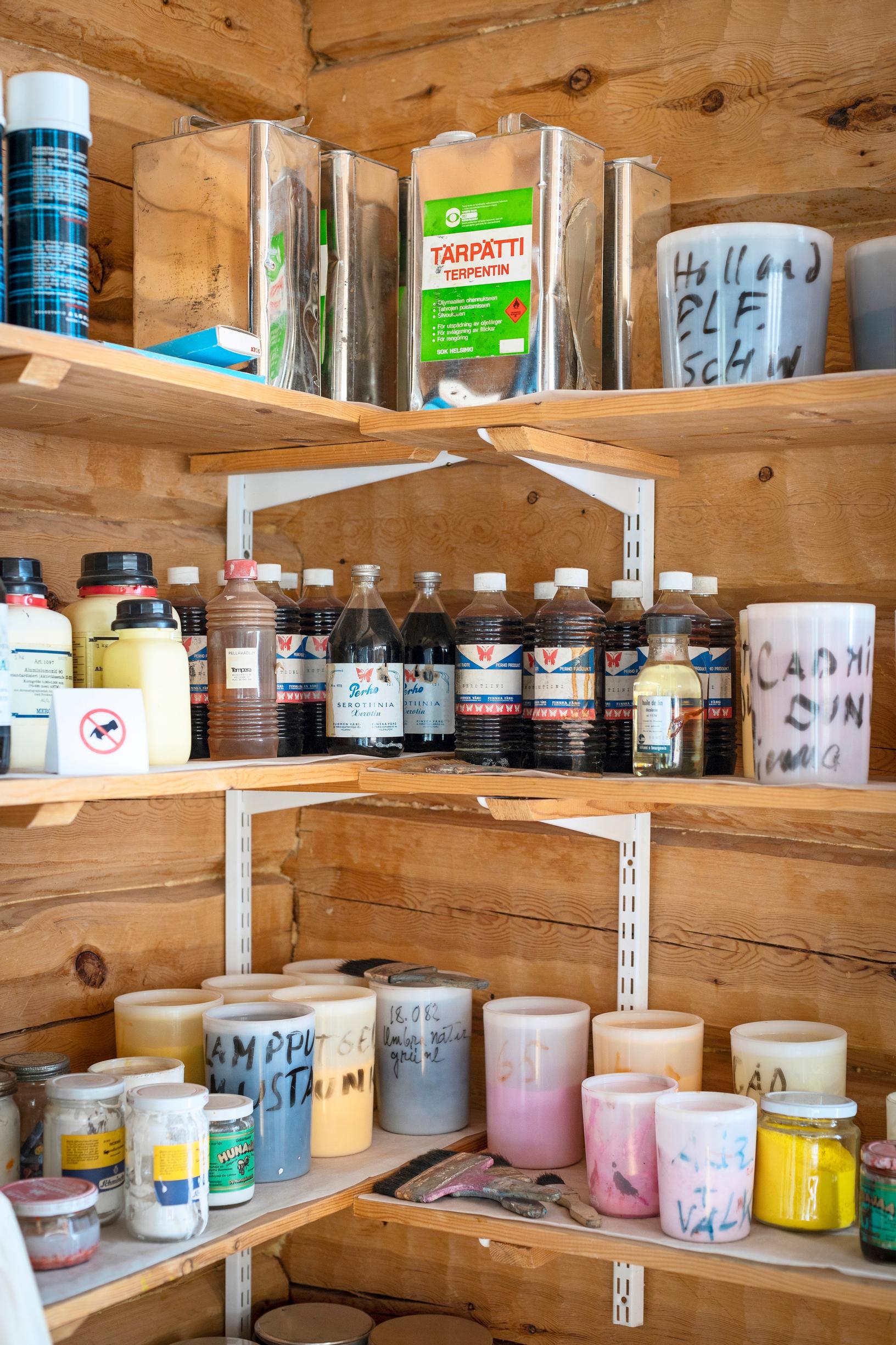 Tilassa on esillä Särestöniemen taiteilijantarvikkeita, lattiassa näkyy jälkiä siinä aikanaan värikylpyjä saaneista teoksista.