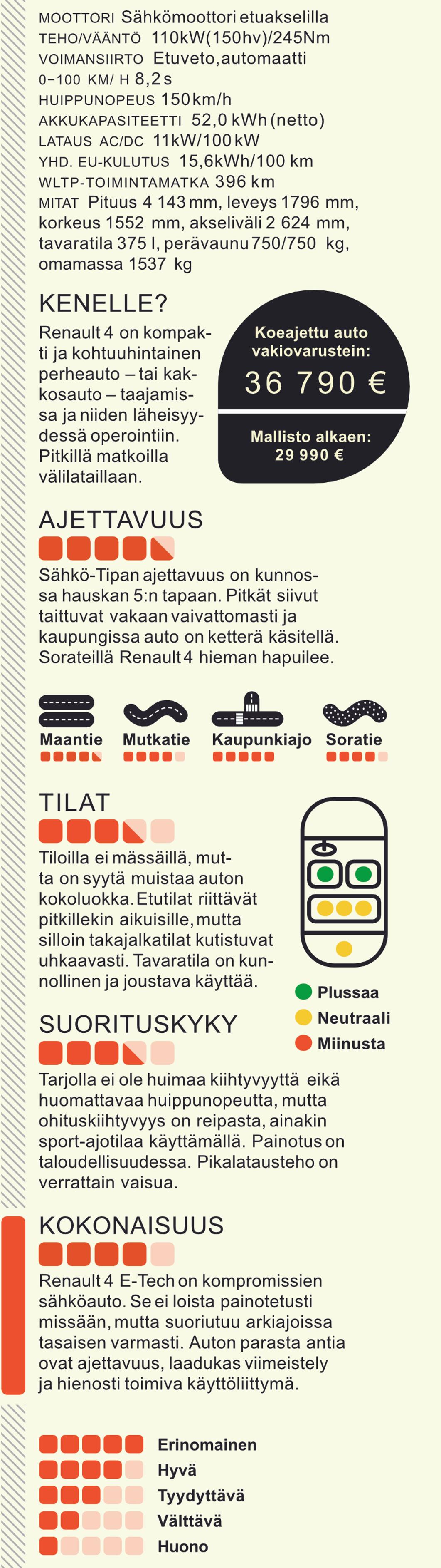Uusi Renault 4 E-Tech ei ehkä loista teknisillä ominaisuuksillaan tai suorituskyvyllään, mutta toisaalta käytännöllisyyttä, karismaa ja kunnianhimoista hinnoittelua voi pitää sen valtteina. Silti on todettava, että isompi ajoakku tekisi tälle(kin) autolle poikaa. C’est la vie!