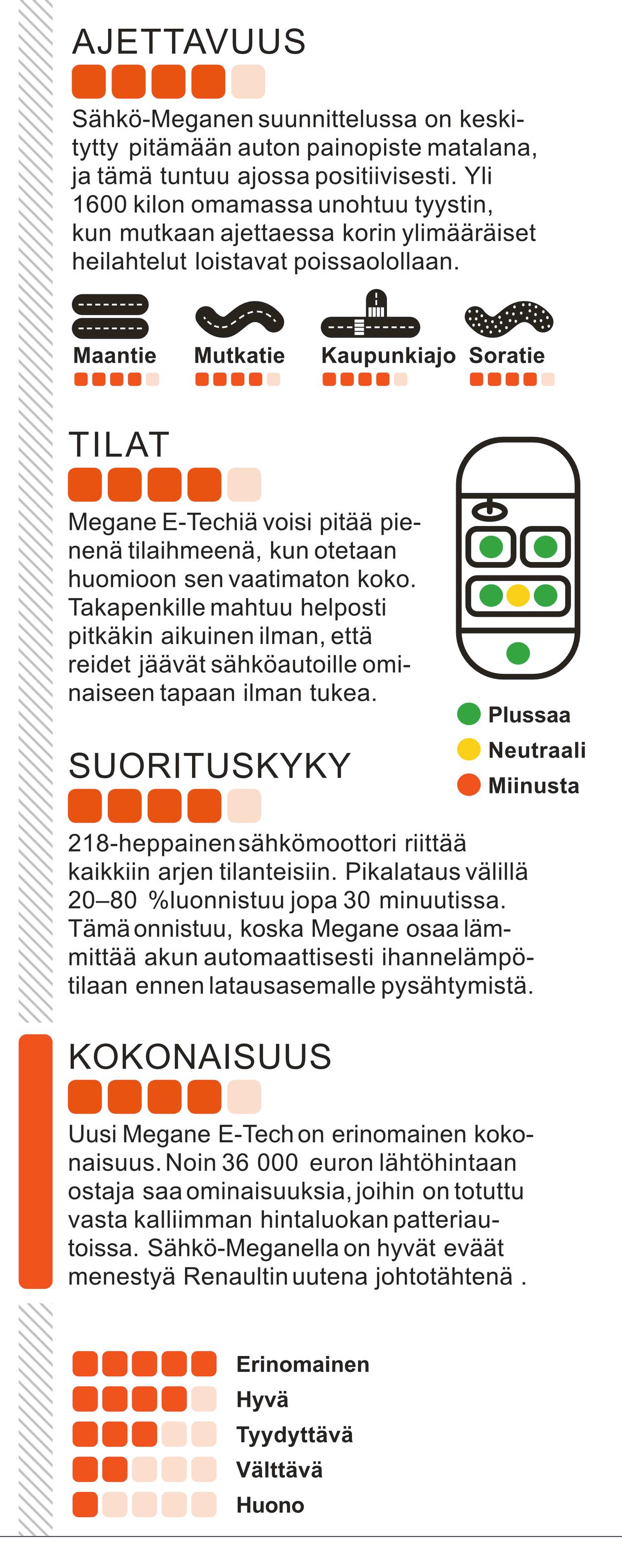 Rattivaihteiden siivekkeitä napsauttelemalla säädellään moottorijarrutuksen tehokkuutta neljällä eri asteella. Toteutus on erinomainen, eikä Espanjan alamäissä jarruun tarvitse koskea ollenkaan. Megane E-Tech on autona hauska ajettava, jossa hyvin viimeistelty ja helppokäyttöinen ohjaamo antaa eväät kilpailla muun muassa Volkswagen ID.3:n kanssa. Nelivetoista versiota autosta ei toistaiseksi tule saataville, mikä voi harmittaa suomalaisia mökkeilijöitä.