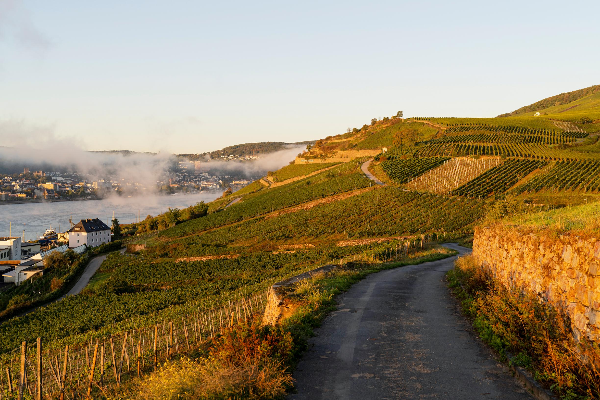 Aamuaurinko saa taivaan hohtamaan persikansävyisenä, ja Reinin yllä leijuu vaaleanpunaisia pilvenhattaroita. Jokea kohti laskeutuu tasaisia viiniköynnösten rivejä. Päivän ensimmäiset valonsäteet saavat niissä roikkuvat rypäleet hohtamaan kuin arvokkaat helmet.
