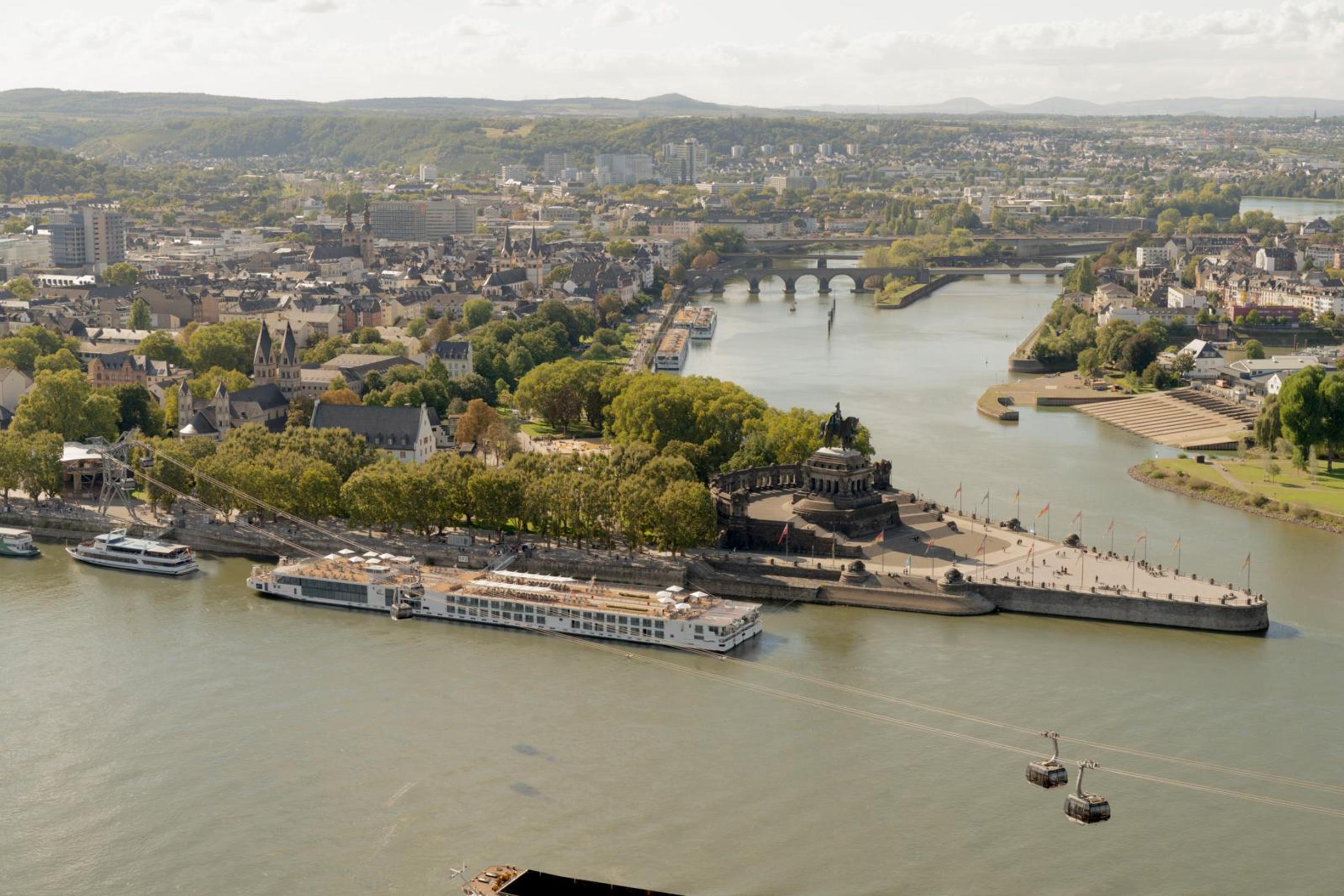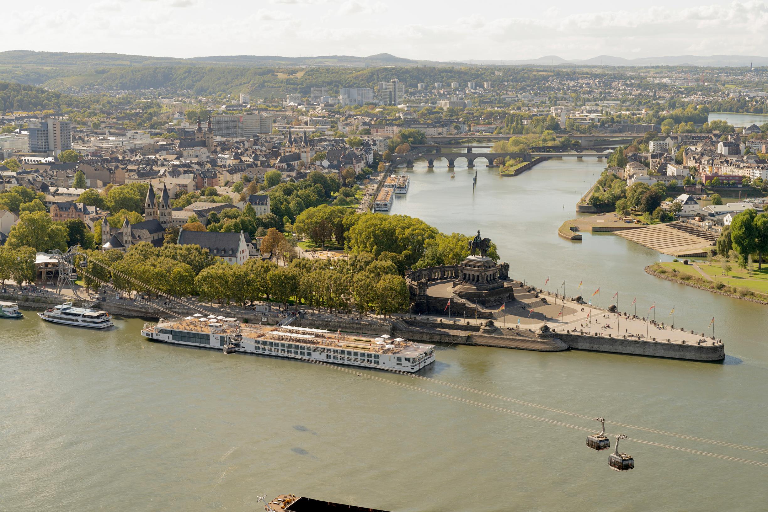 Aamupalasali on jo täynnä reippaita matkalaisia valmiina päivän seikkailuun. Pian ohitamme Koblenzin tunnetuimman nähtävyyden Deutsches Eckin eli ”Saksalaisen kulman”. Se on kohta, jossa Rein ja Moseljoki kohtaavat.