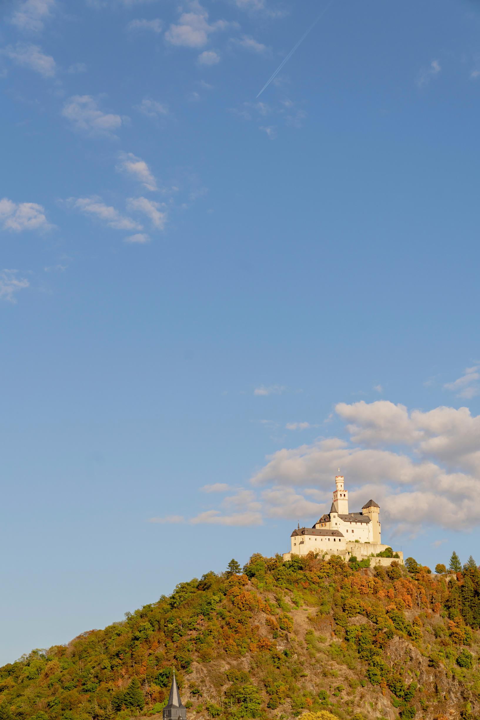 Näemme monia linnoja, kuten alueen kruununjalokiveksi kutsutun Stolzenfelsin. Valkoista palatsia koristavat lukuisat vartiotornit, ja sen suojasta löytyy muun muassa italialaistyylinen puutarha suihkulähteineen. Matkustajat kerääntyvät tallentamaan näkyä kameroineen ja puhelimineen.
