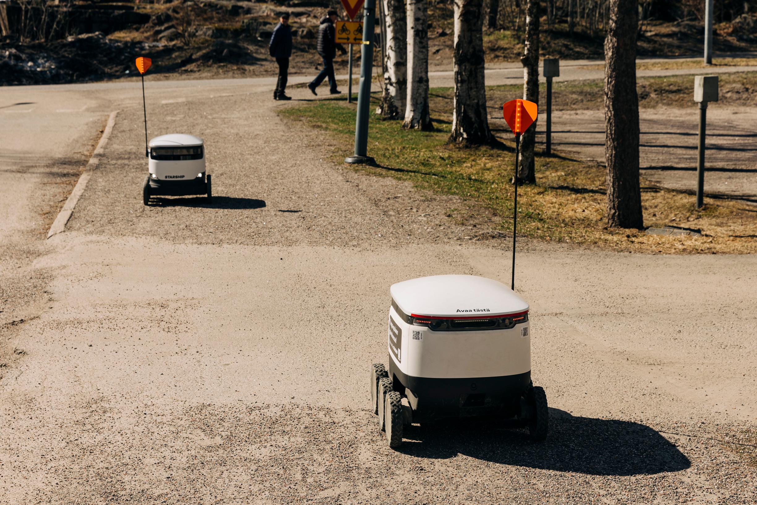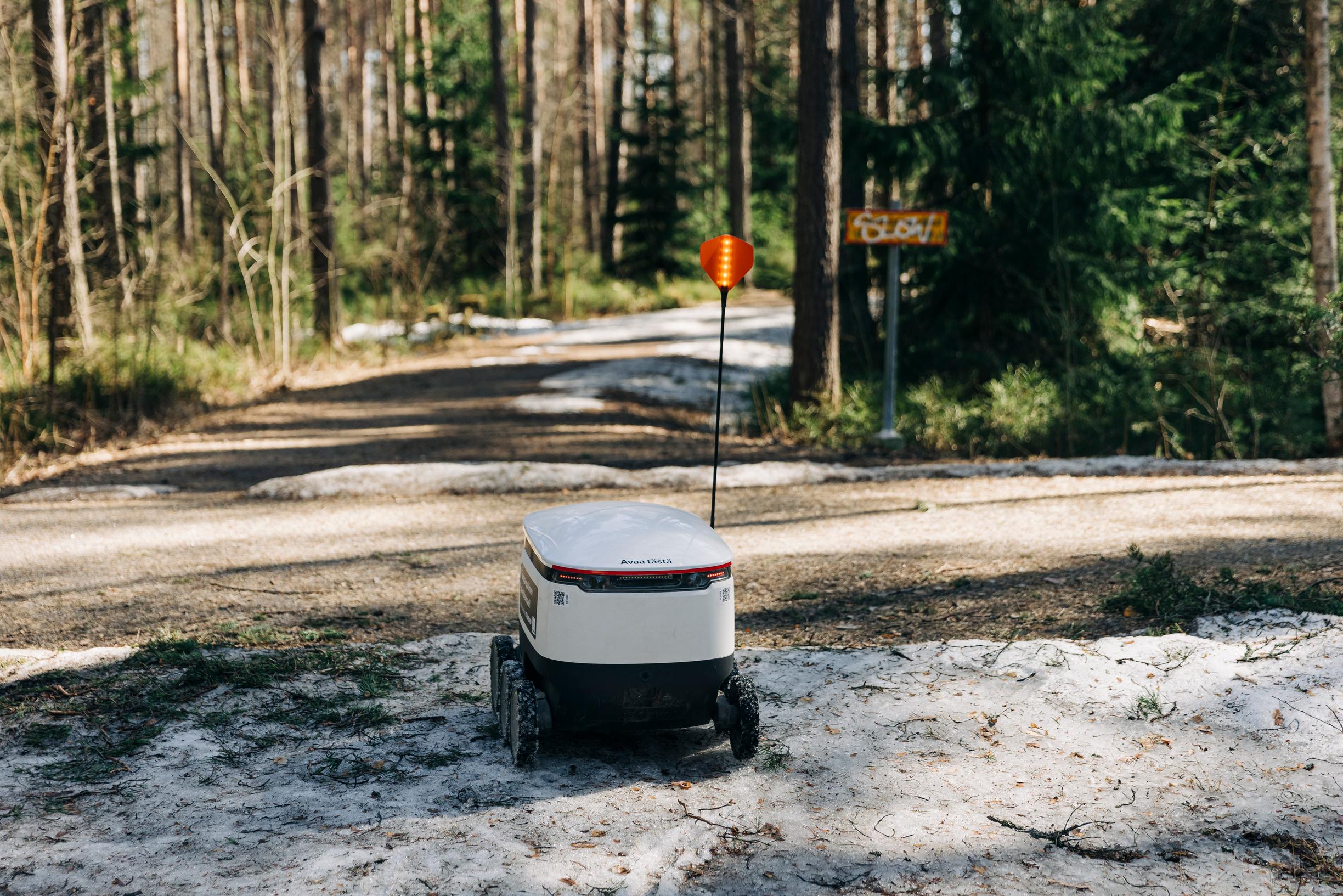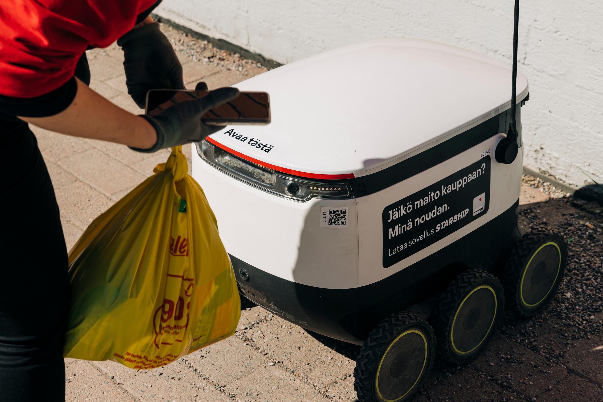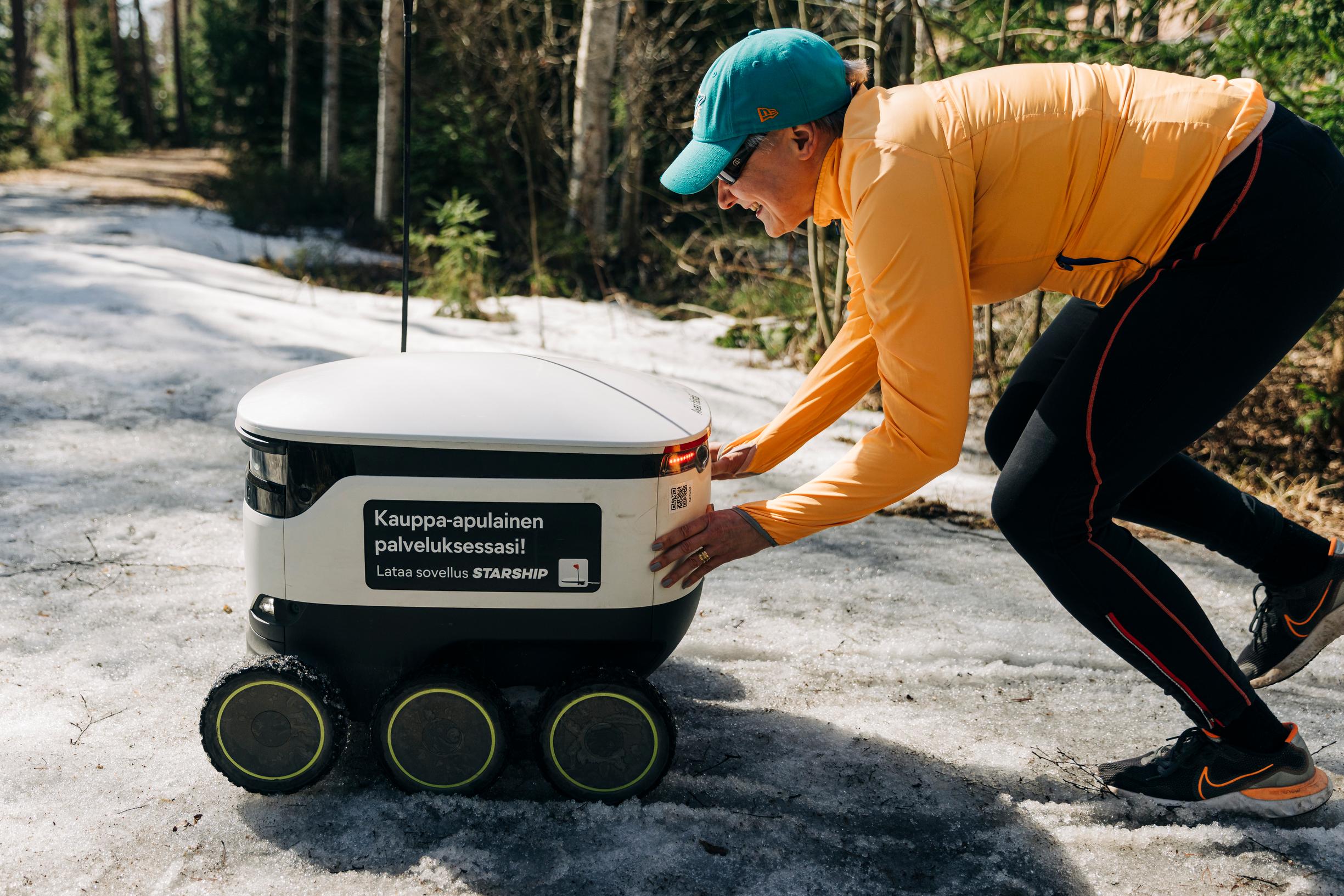 Aurinkoisena iltapäivänä Laajalahden Alepan edessä vuoroaan odottelee useampi robotti. Pian omamme on lastattu ja pääsemme seuraamaan sen matkaa. Sympaattinen kauppa-apulainen empii hetken paikallaan, suunnittelee selkeästi sopivaa reittiä. Sitten se lähtee päättäväisesti matkaan.