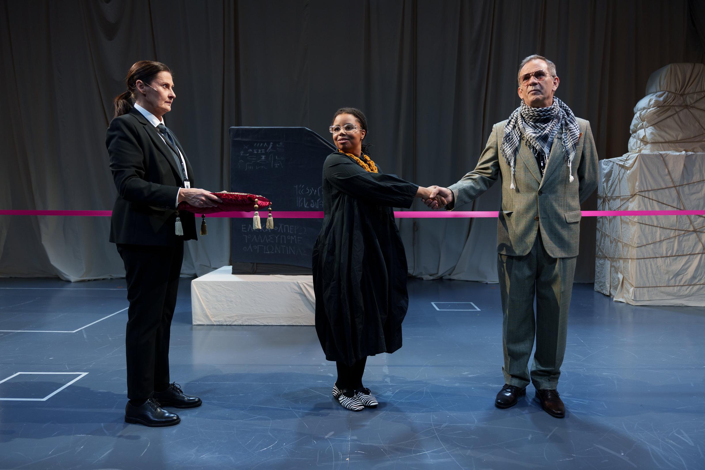 Aikalaispuvut ovat vaikuttavia, ja pelkistetty lavastus vie heti museon takahuoneeseen. Sarkofagikin taipuu yllättävän moneen. Sekä lavastus että puvustus ovat Anna Sinkkosen käsialaa. Pidin myös kovasti näytelmän tavasta esittää Rosettan kiven historiaa museoon sopivaan tyyliin. Näytelmässä kuullaan ja nähdään useita kieliä, ja kommunikoinnin ongelmaa alleviivattiin kekseliäästi seinälle ilmestyvillä tekstityksillä, jotka keskustelun kiihtyessä alkoivat juosta toistensa päälle.