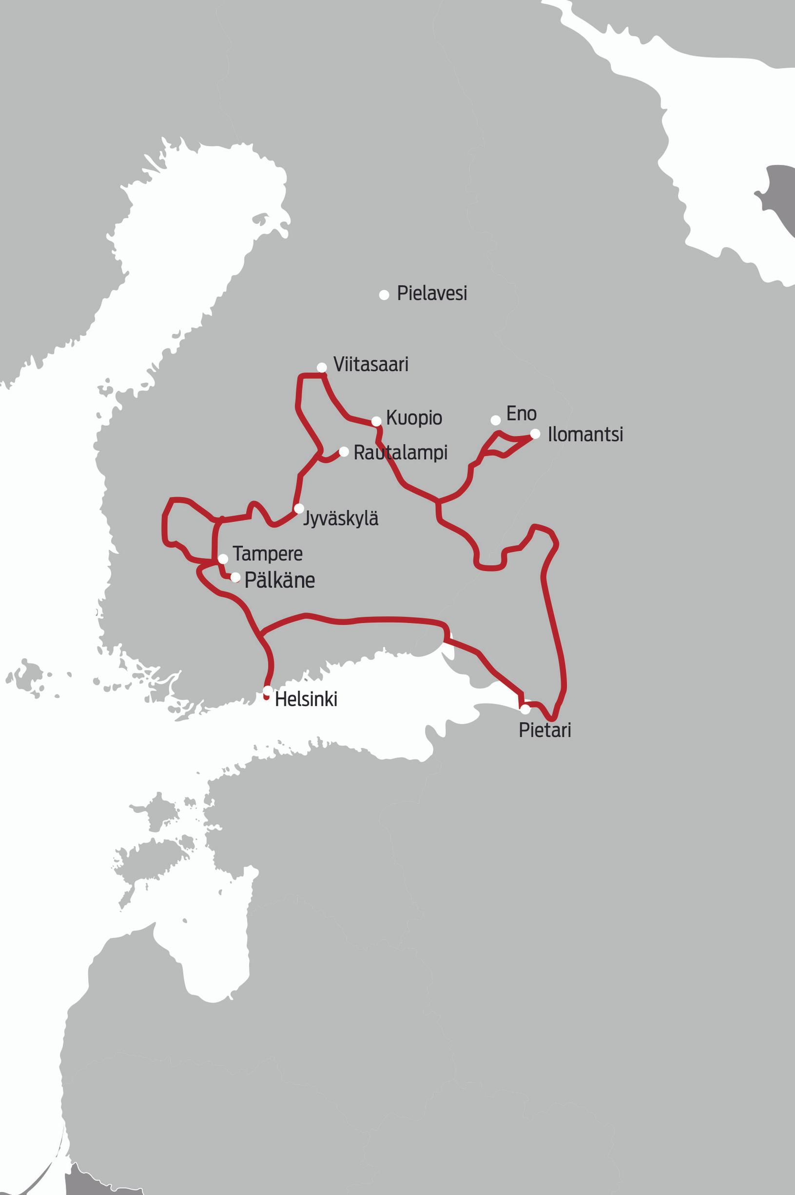 Retziuksen retkikunnan reitti Suomessa vuonna 1873.