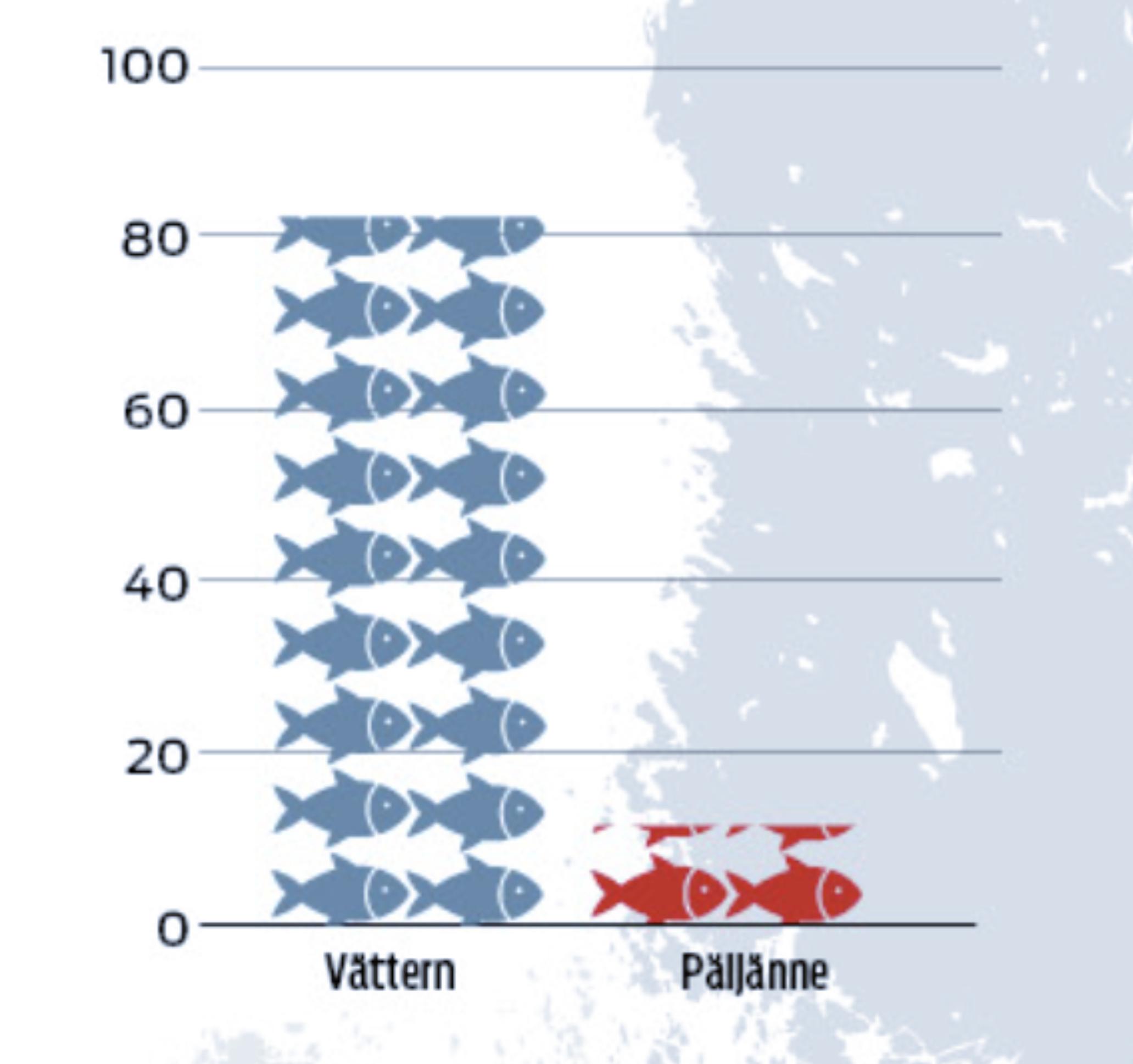 Sama tilanne on muuallakin. Suomen lähes 60 000 yli hehtaarin kokoista järveä tuottavat keskimäärin huomattavasti vähemmän ja pienikokoisempaa arvokalaa kuin eräät tutkitut ruotsalaiset järvet. Luonnonvarakeskuksen (LUKE) tutkija Jukka Ruuhijärvi kiteyttää kalamaaottelun tulokset ja Suomen häviämisen syyt.