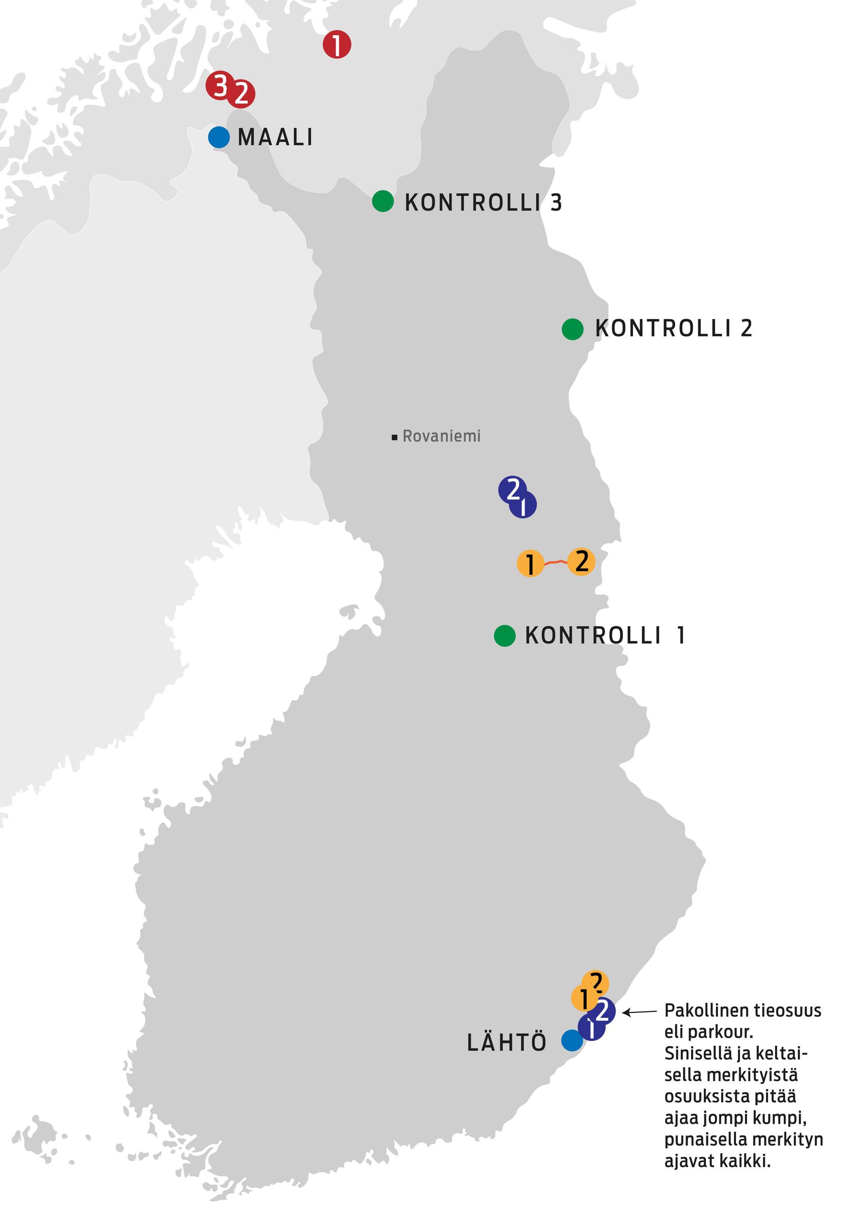 Kolmoskontrolli Enontekiön Kalmankaltiossa on viimeinen pakollinen pysähtymispaikka Suomen puolella. Siitä matka jatkuu Enontekiön keskustaajaman Hetan kautta rajan yli Kautokeinon kautta kohti Altaa Jäämeren rannalla.