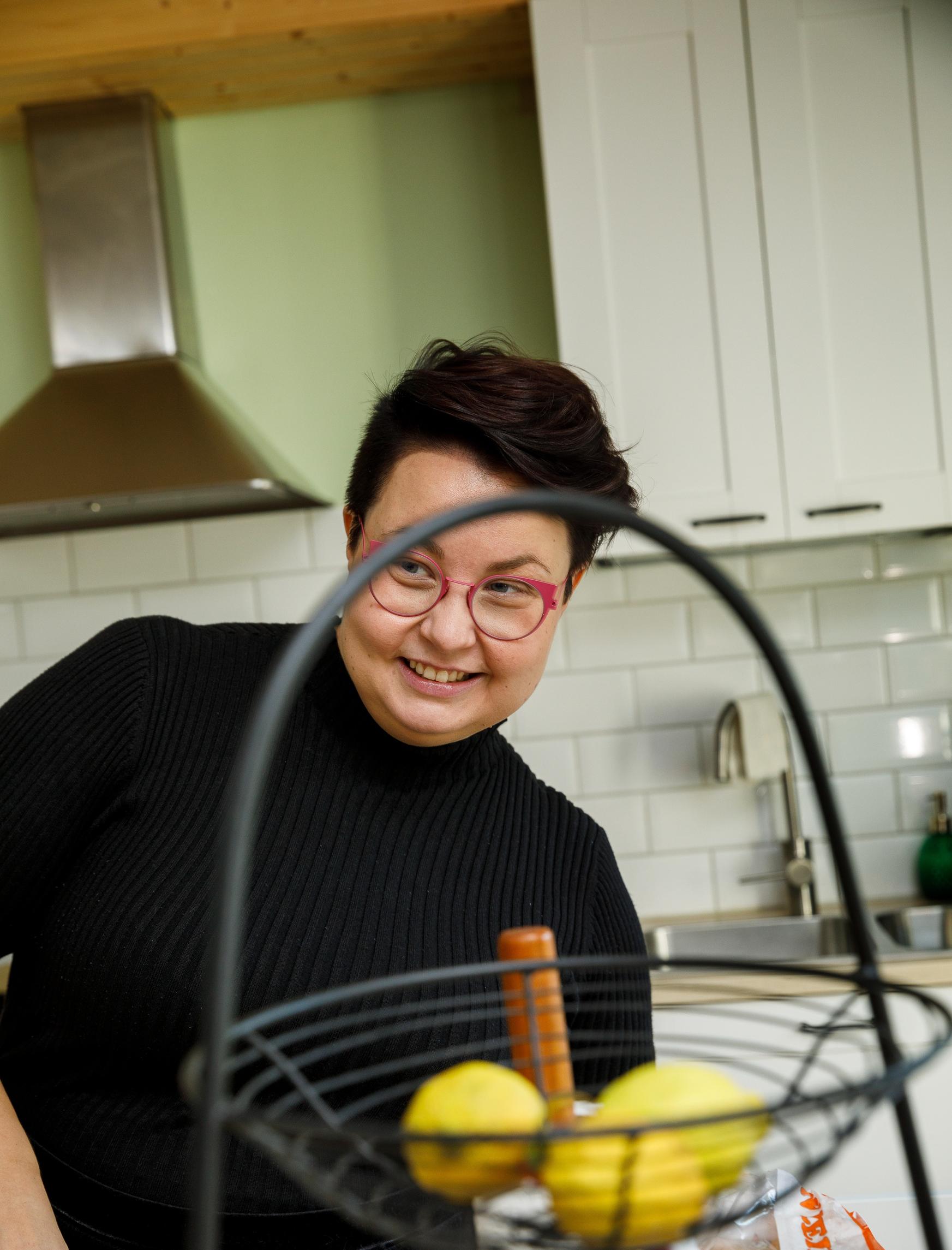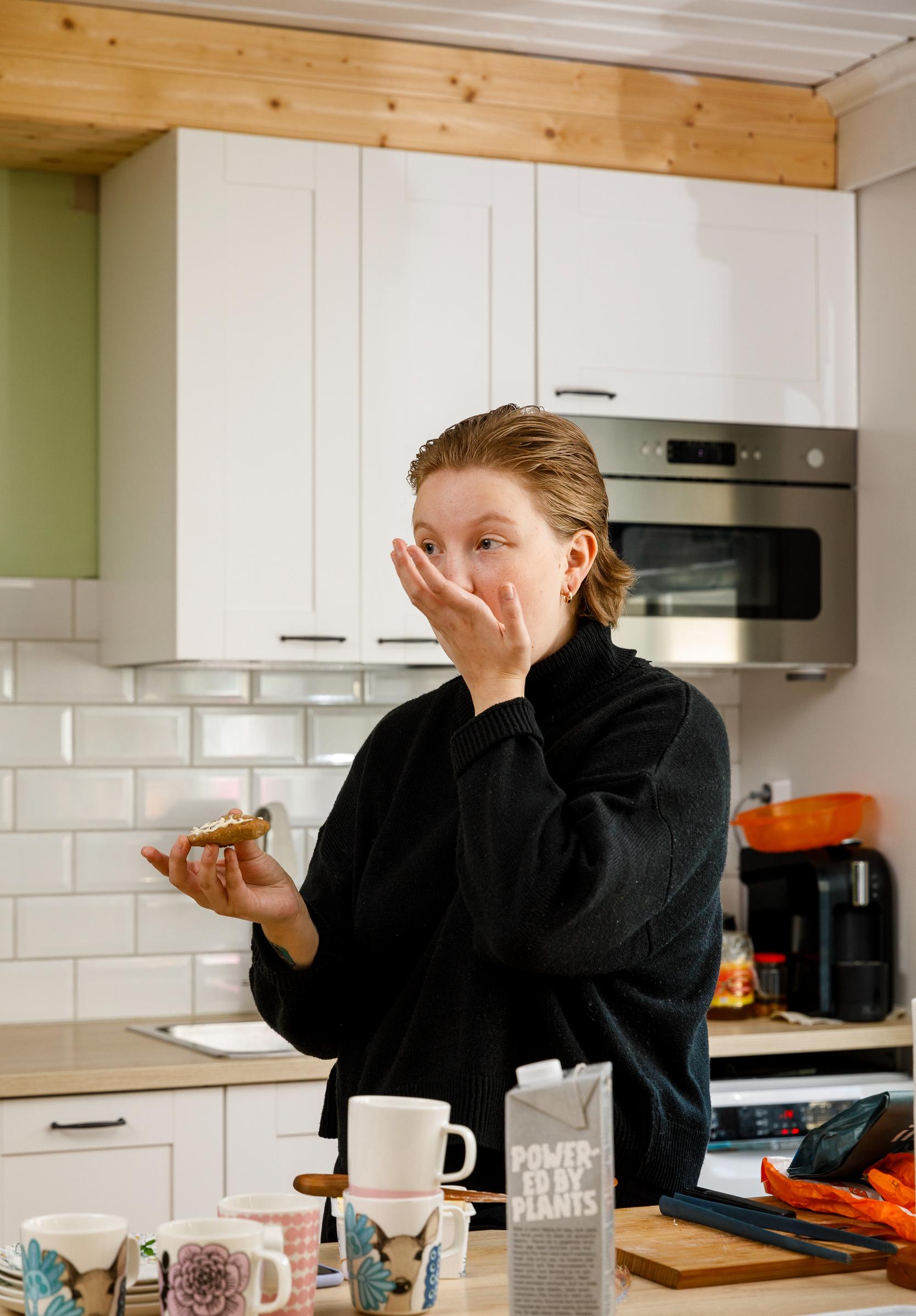 Kun ovikello soi ja Wolt-kuski tuo ruoat, Emmi käy eteisessä hakemassa ne.