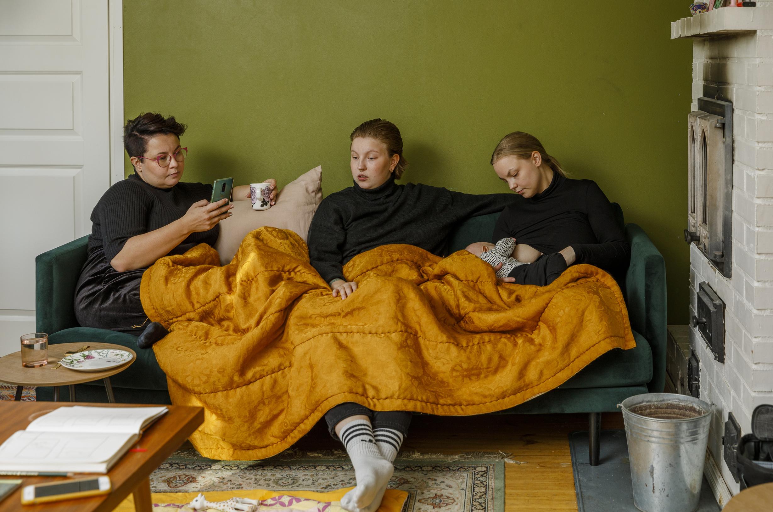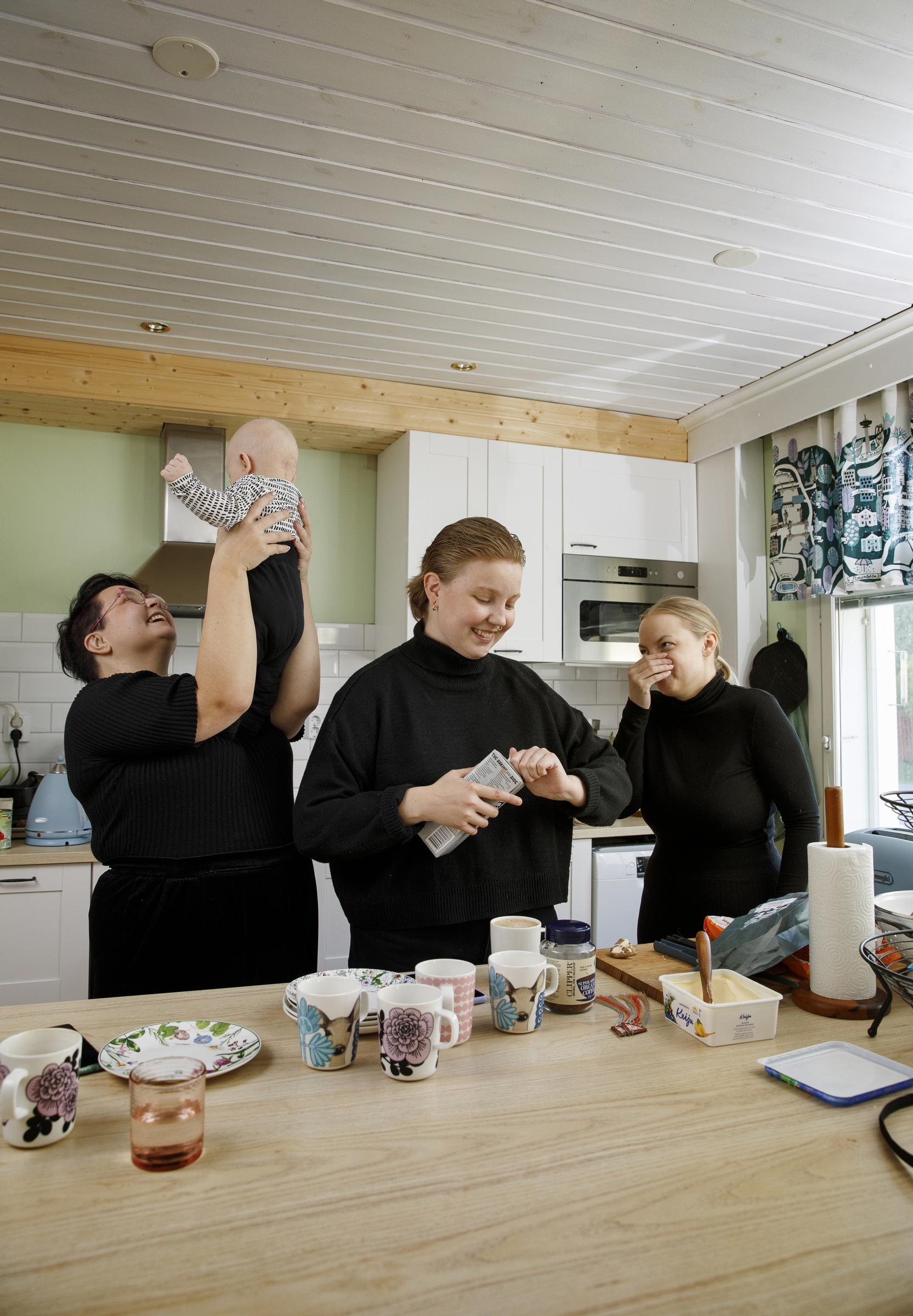 Vähän ajan kuluttua saapuu myös Miisa vauvansa kanssa. Tädit koppaavat hyväntuulisen viisikuukautisen vuoroin syliinsä.