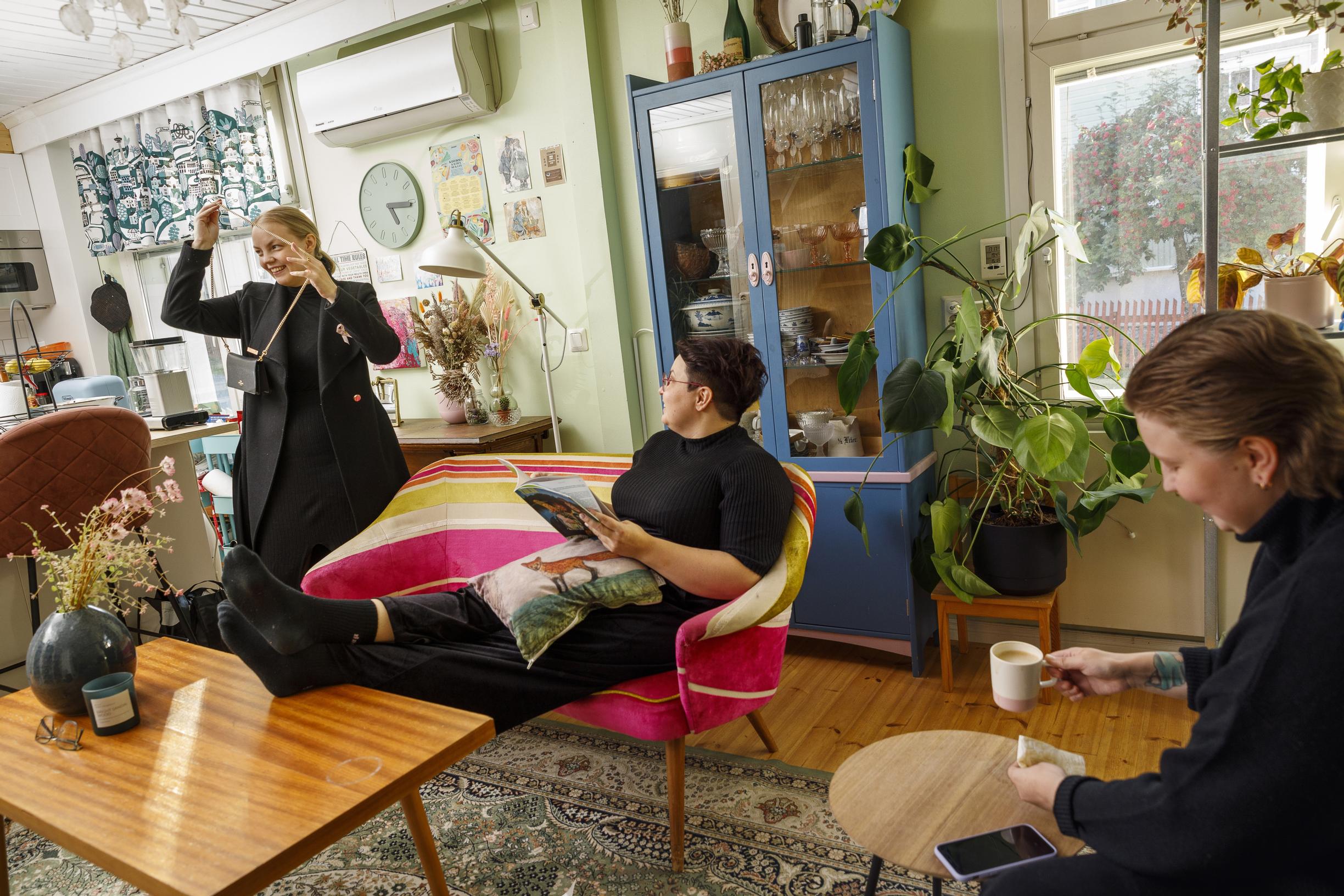 Miisan lähdettyä Sunná valittelee jäykistynyttä selkäänsä ja siirtyy olohuoneen nojatuoliin. Emmikin asettuu olohuoneen tummanvihreälle, siistille samettisohvalle. Lapsiperheessä vääjäämättä syntyvät tahrat saa kuulemma siitä rätillä pois.