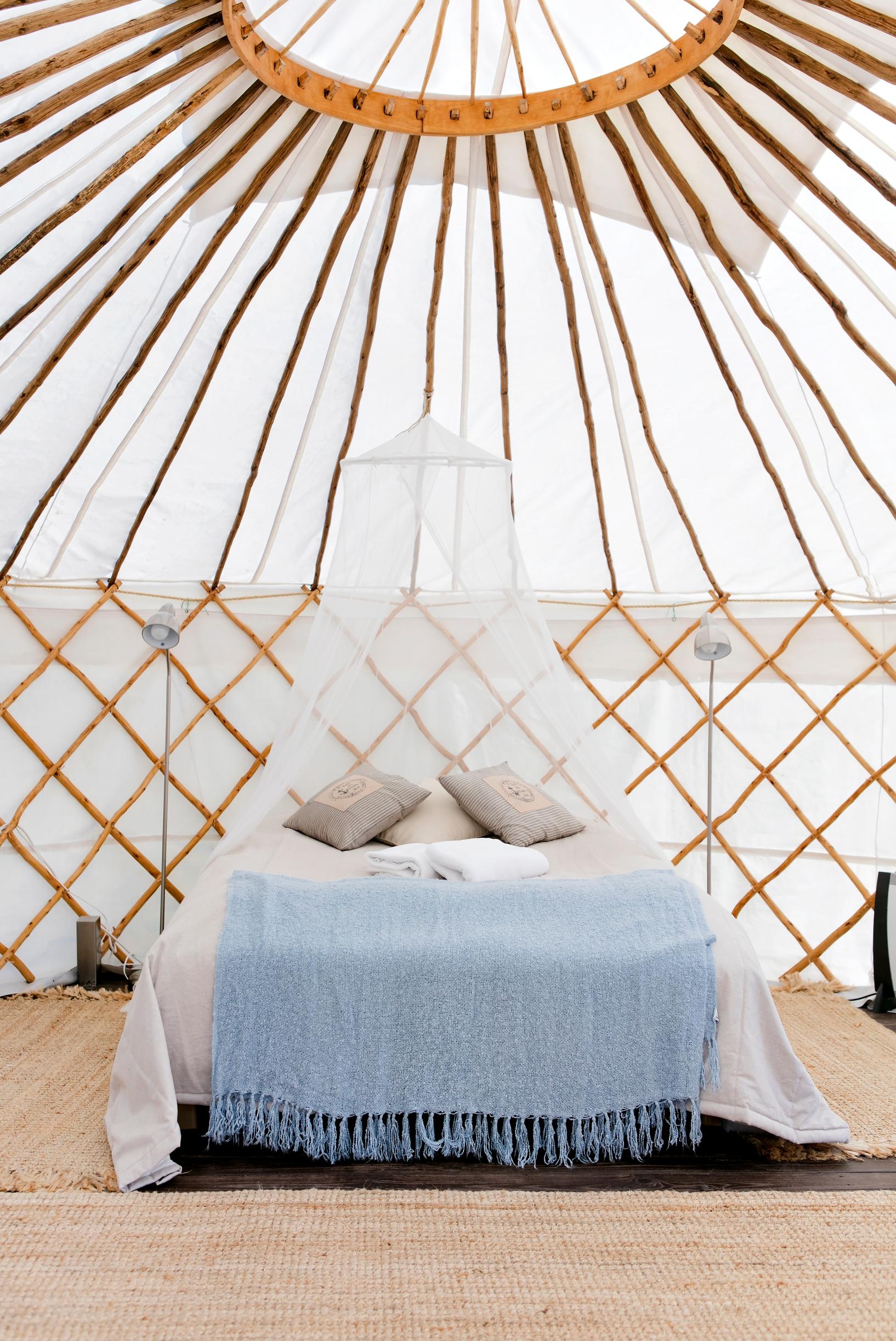 Varustelutaso on yllättävän hyvä paimentolaismajaksi: on jääkaappi, sähkövalot, lämmitys, parisänky, avattava vuodesohva ja työpöytä. Suihkussa ja wc:ssä pitää käydä leirintäalueen tiloissa. Vierestä löytyy myös grillikatos, uimaranta ja sauna.