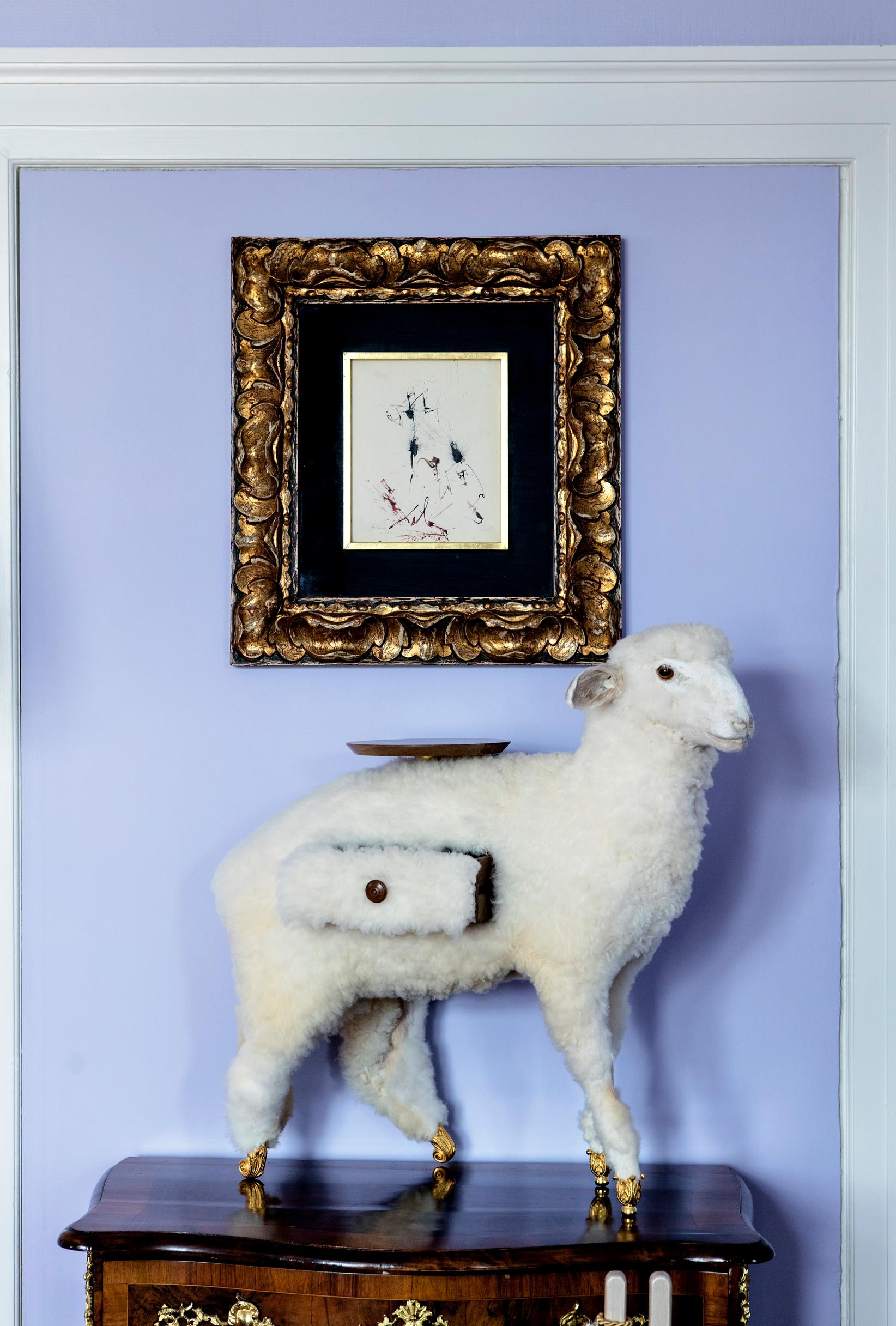 Nurkassa on täytetty lammas, jonka kyljestä avautuu pöytälaatikko. Lattialla on punaisten huulten muotoinen sohva ja viereisen huoneen pöydällä valuvaa kelloa esittävä pronssiveistos.