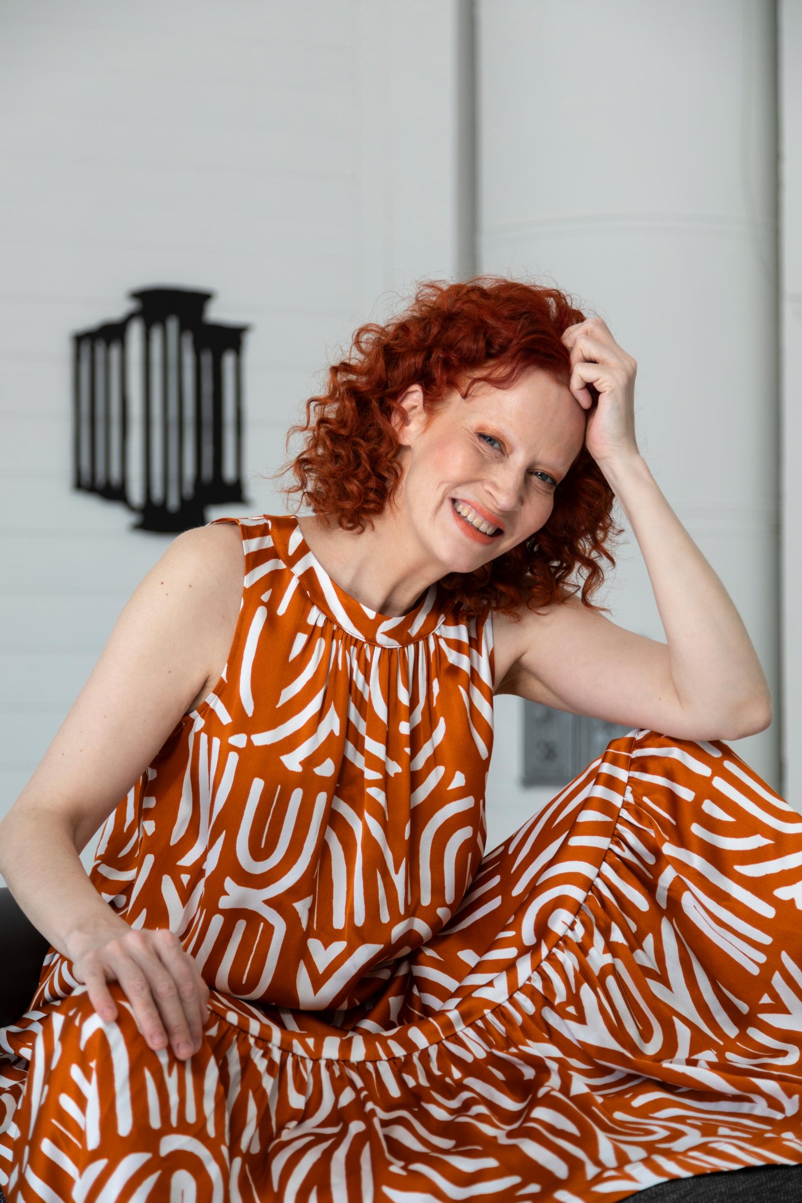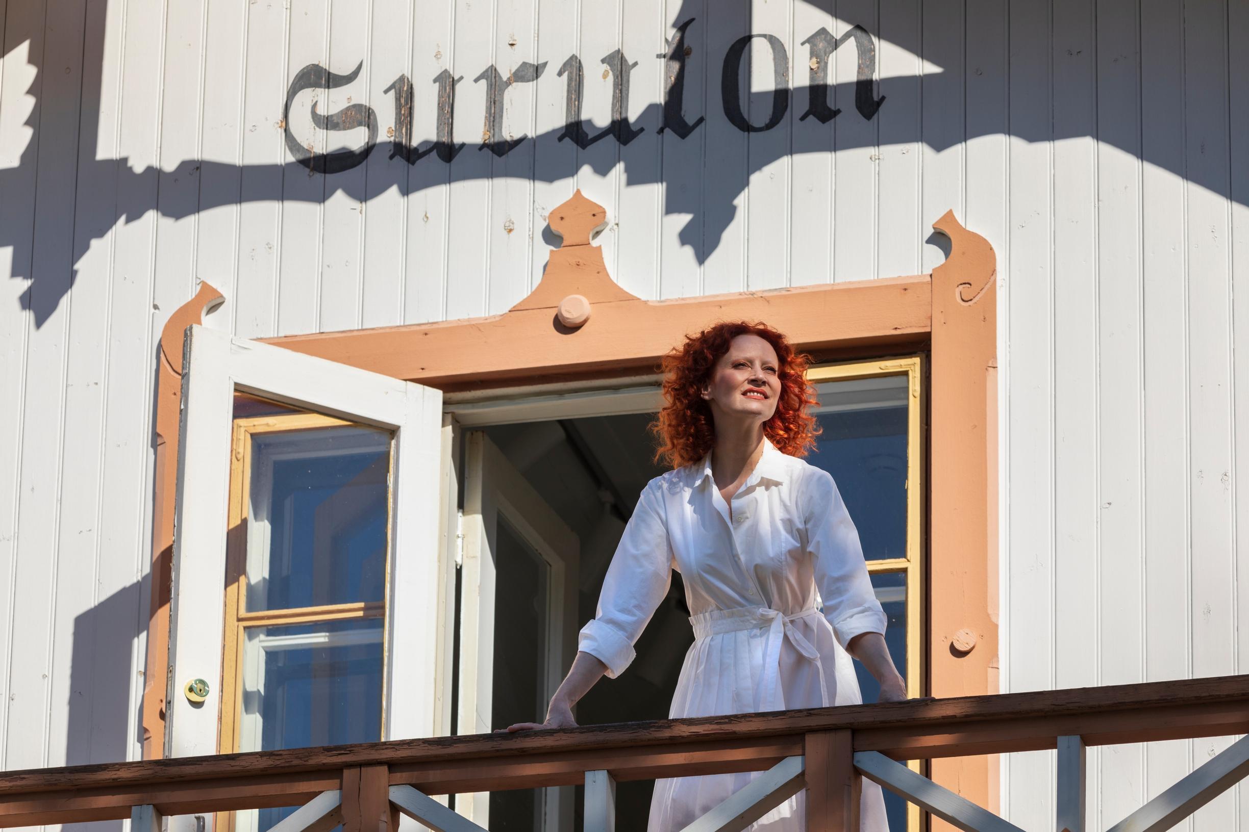 Punatukka herättää huomiota Savonlinnan keskustassa. Paikalliset katsovat ujosti ja turistit ihastuneesti tietämättä, kuka Saimi Hoyer on.