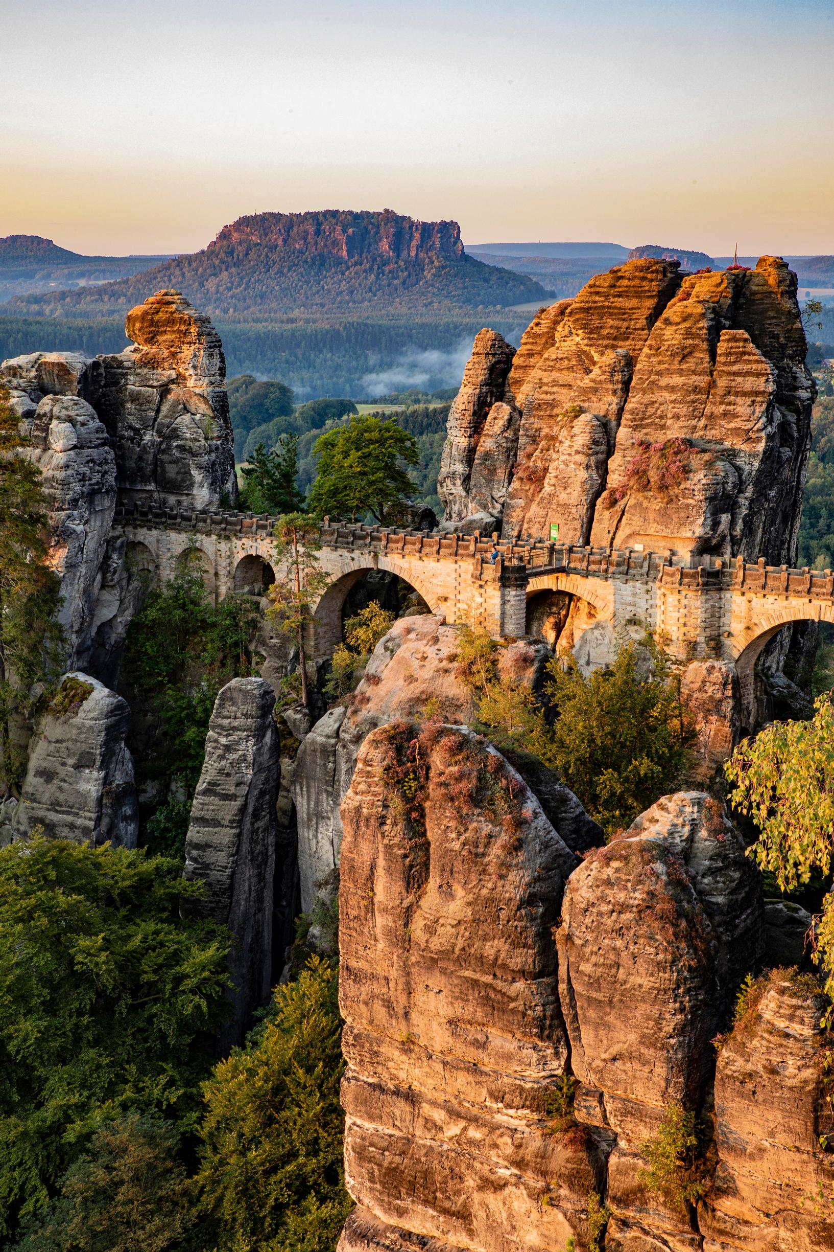 Olemme Saksin Sveitsin kansallispuistossa, Saksan kaakkoisosissa. Lähin iso kaupunki on Dresden, ja Tšekkiin ja Puolaan on kivenheiton matka. Saksin Sveitsi on noin neljän miljoonan asukkaan osavaltion tärkein luontokohde ja edessä näkyvä Bastei (linnake) sen suosituin nähtävyys. Kansallispuisto ei liity mitenkään Sveitsiin, jonne on matkaa yli 500 kilometriä. Nimen keksivät 1700-luvulla Dresdenin taideakatemiaan tulleet sveitsiläiset, joiden mielestä alue muistutti heidän kotiseutuaan.