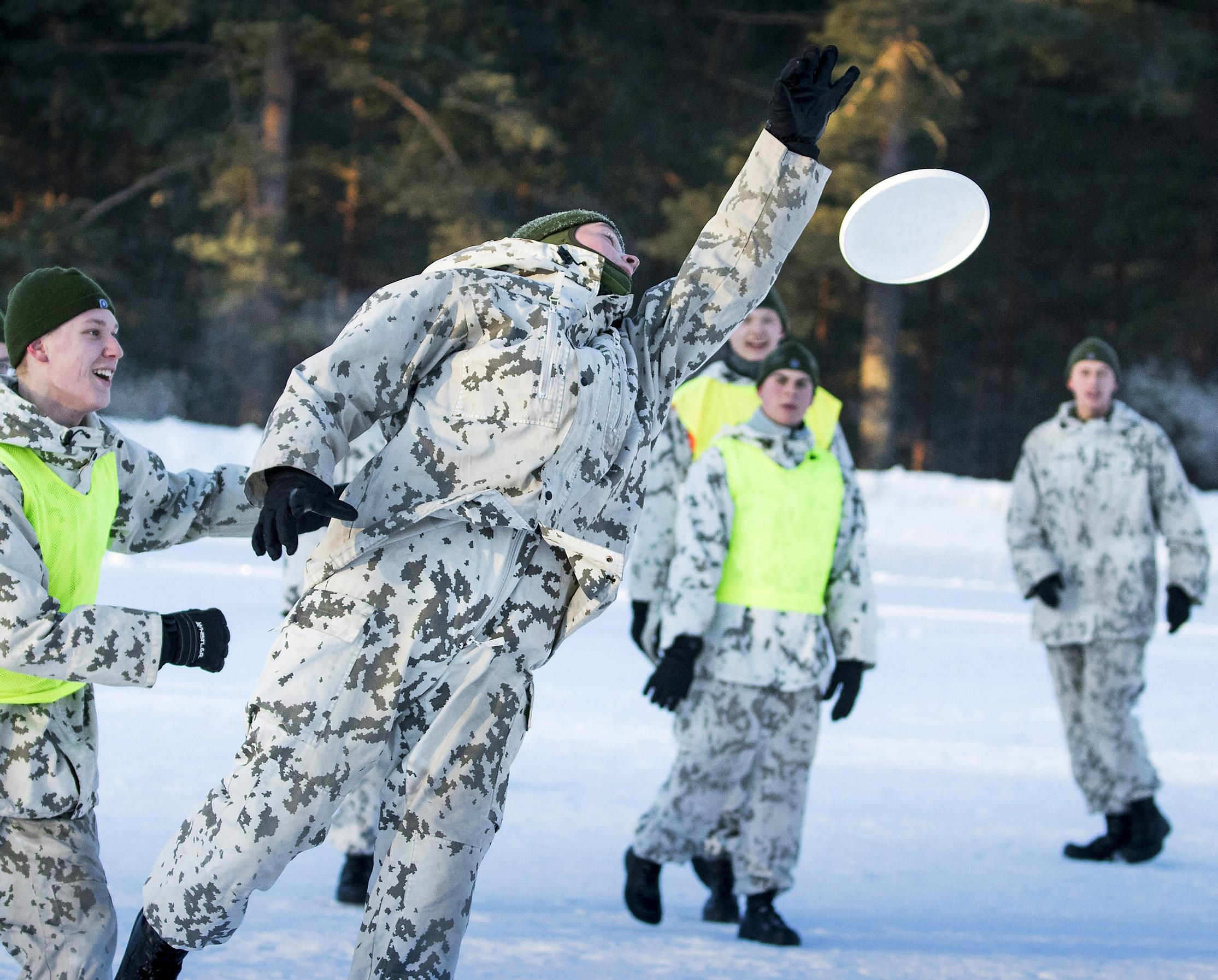 Aurinko on vasta punannut mäntyjen latvukset, ja pakkasta on parikymmentä astetta. Valkoisiin maastopukuihin pukeutuneet nuorukaiset juoksevat urheilukentällä. Kun frisbee lentää mieheltä toiselle ultimate-pelissä, koko porukka on yhtä jalkojen ja käsien sekamelskaa.