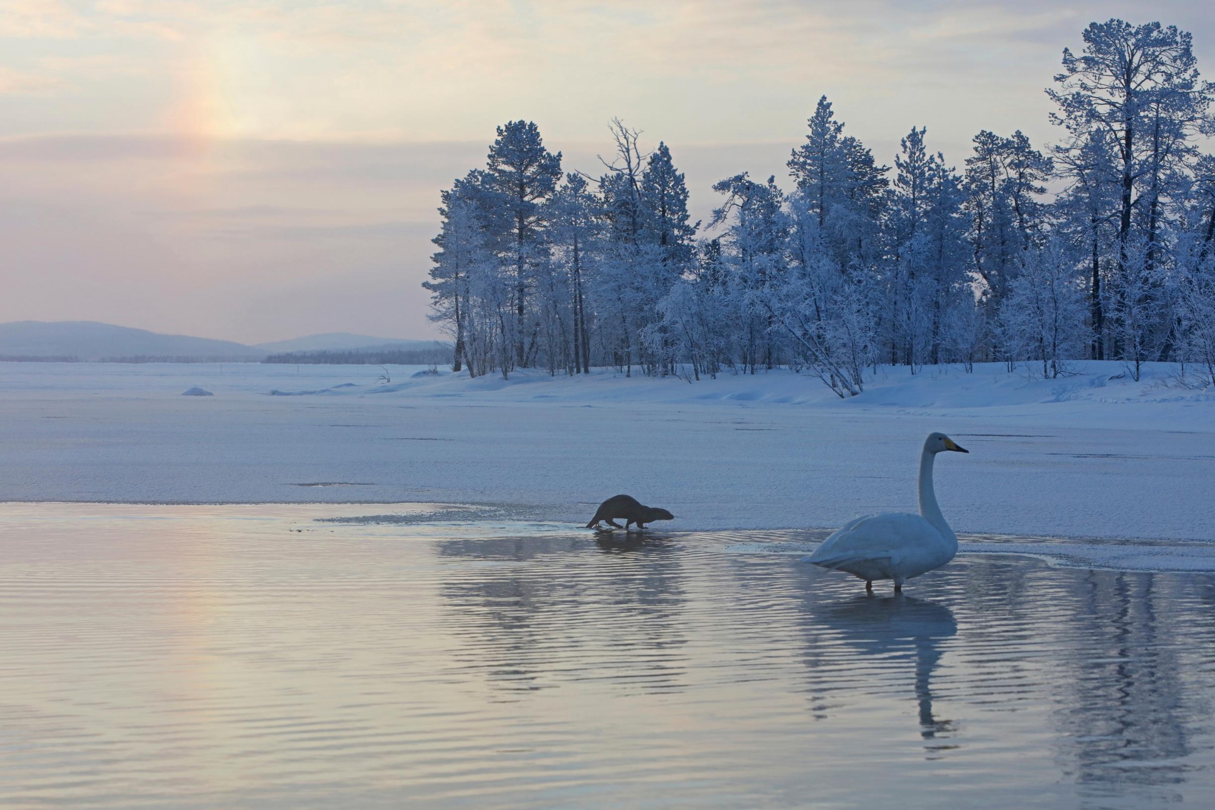 Oli helmikuinen kylmä, mutta aurinkoinen pakkaspäivä. Tähyilin joutsenia Muoniossa Kutunivan äärellä. Tässä luonnonkauniissa paikassa Jerisjärvi laskee viereiseen Törmäslommollampeen ja muodostaa nopeasti virtaavan joenkohdan, nivan, joka pysyy sulana kovimmillakin pakkasilla.
