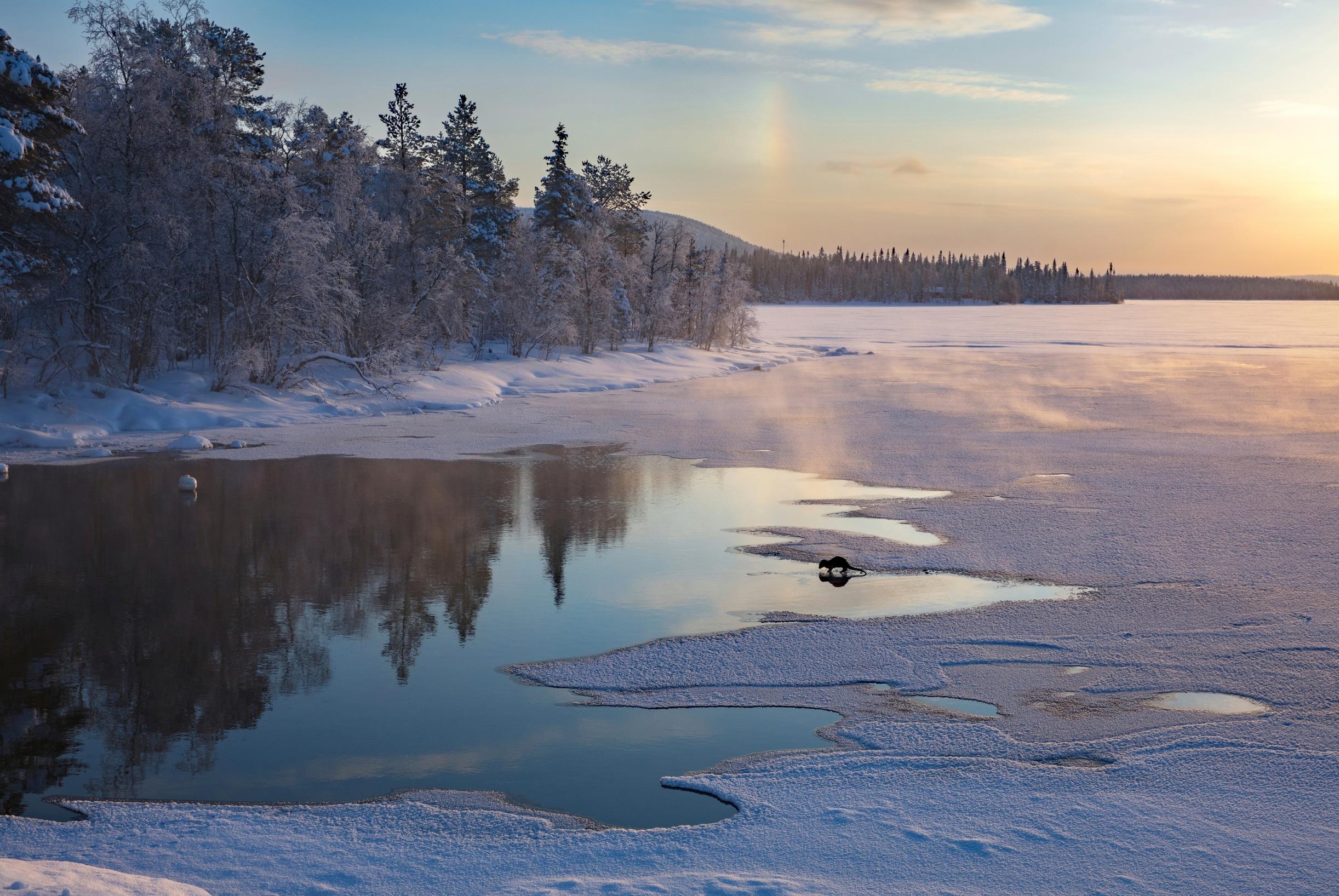 Kirpeä pakkasaamu valkenee Muonion Kutunivalla. Paikka pysyy sulana ympäri vuoden.