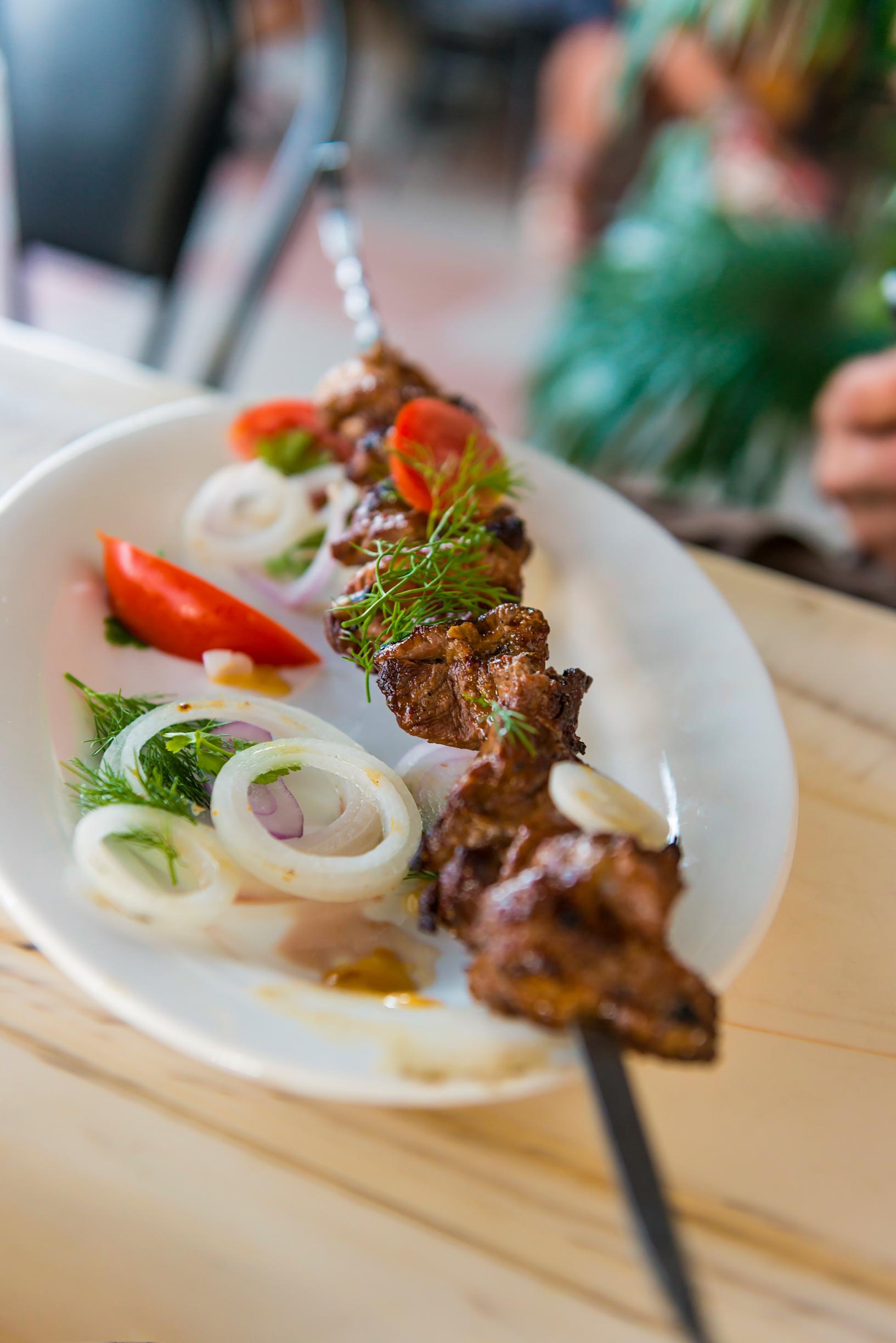 Kirgisiassa kannattaa aina selvittää, missä on oman majapaikan alueen šašlik-kuja. Joka kaupunginosasta löytyy šašlik-grillivartaita tarjoavien ravintoloiden keskittymä. Vartaan, tomaatti-kurkkusalaatin ja ljebuška-leivän sisältävä ateria maksaa seitsemisen euroa. Perinneruokia, kuten hevosenlihapastaa eli bešbarmakia, on paras kokeilla maaseudulla tai kotiruokaillalliselle kutsuttuna.