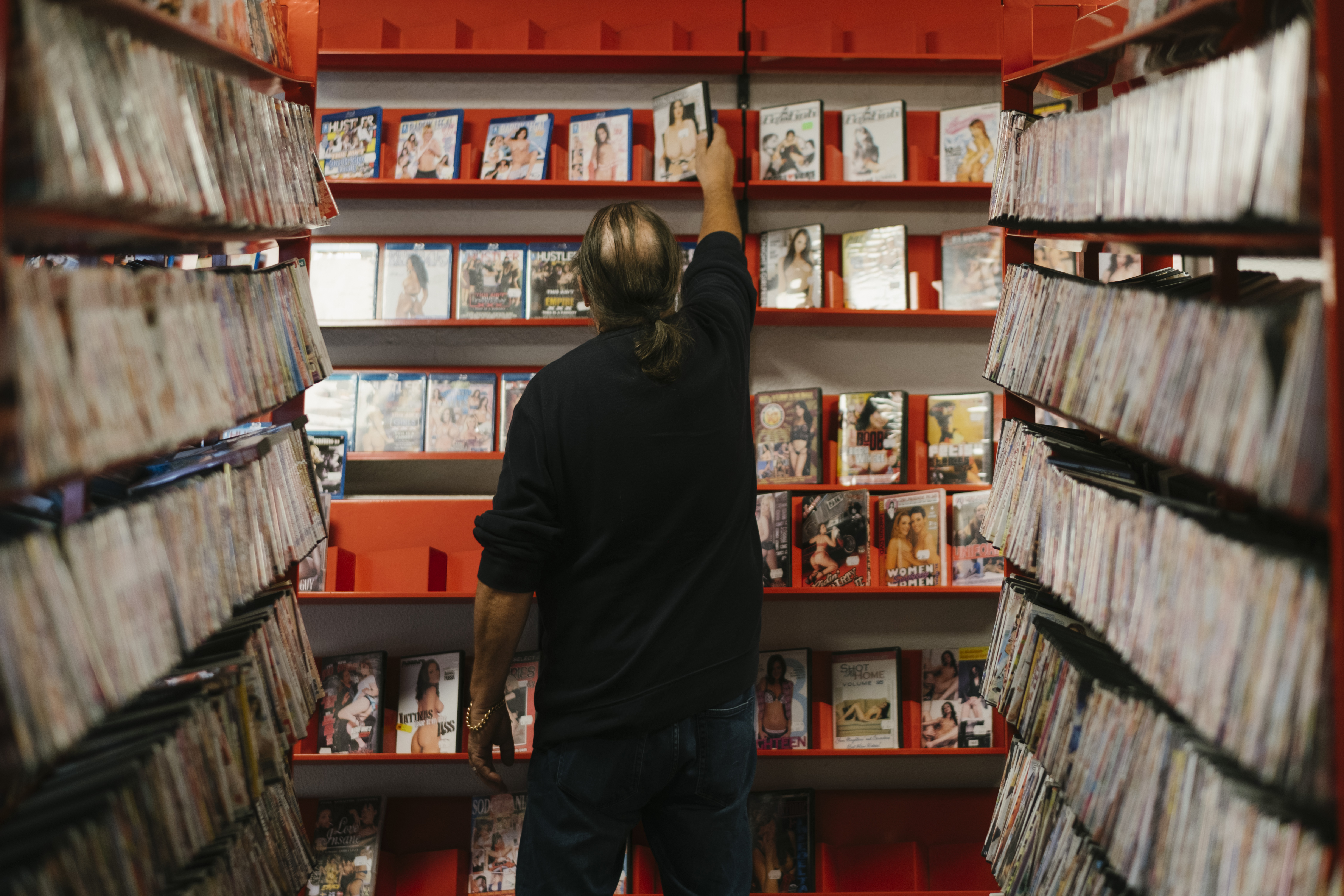 Muutamia miehiäkin tulee sisään, mutta heistä pääosa näyttää suuntaavan myymälän Cinema & Cruising -osastolle, jonka pimeillä käytävillä olevissa huoneissa pyörivät pornoelokuvat. Huoneissa on mahdollisuus myös harrastaa seksiä joko yksin tai isommallakin porukalla.