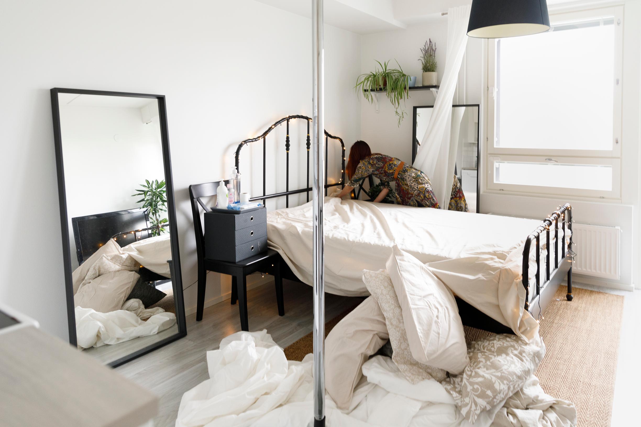 Tamperelaisen kerrostalohuoneiston sisustuksena on leveä parivuode, pieni pöytä ja keskellä huonetta sijaitseva tanssitanko. Yksiö on 24-vuotiaan Myyn työhuone, jossa hän myy seksipalveluja yli 30-vuotiaille miehille.