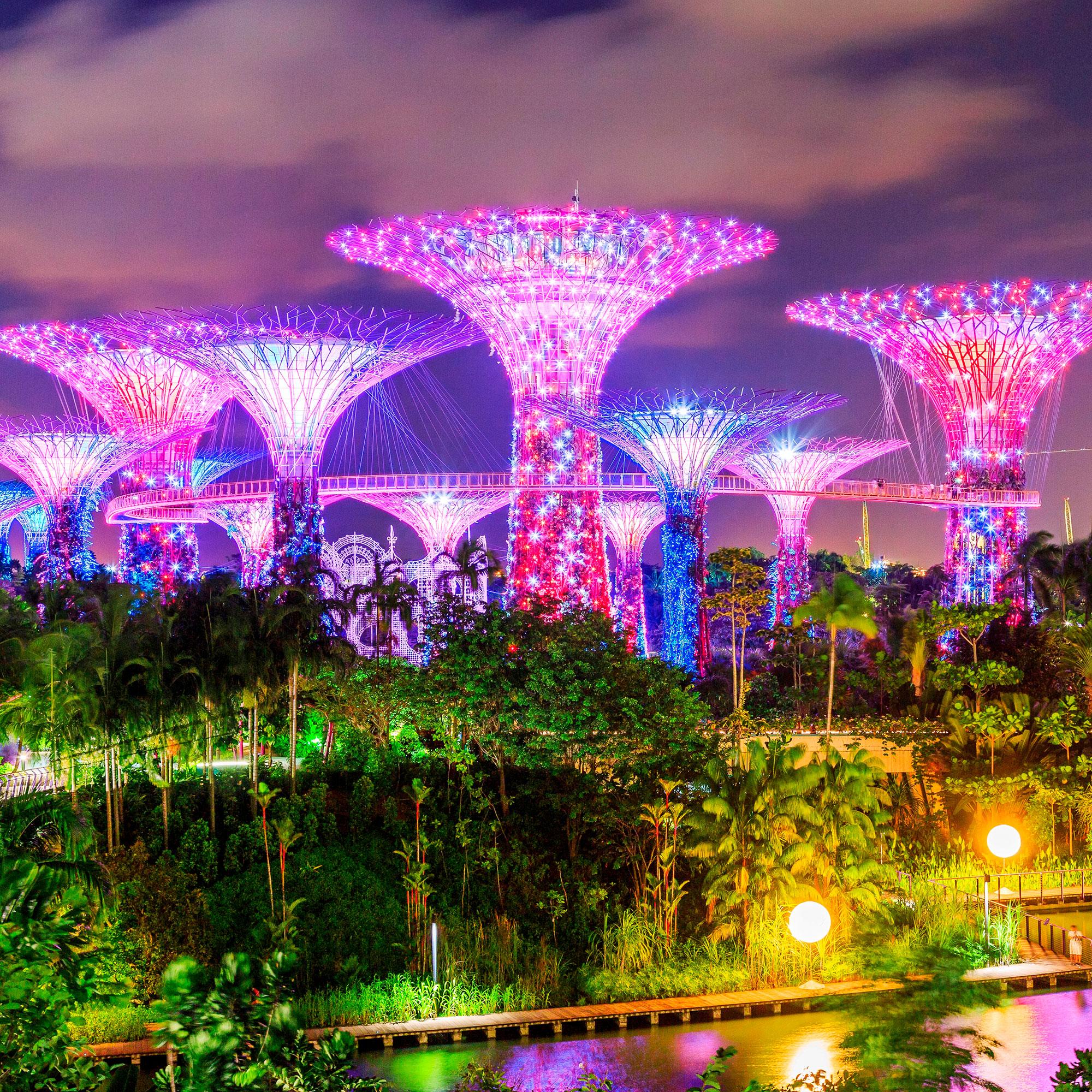 Yhden puun huipulla on ravintola, ja parin puun väliin 20 metrin korkeuteen on rakennettu kävelyramppi, mistä maisema aukeaa uudenlaisena. Puutarhan päivittäistä valo- ja musiikkispektaakkelia ei kannata jättää väliin.