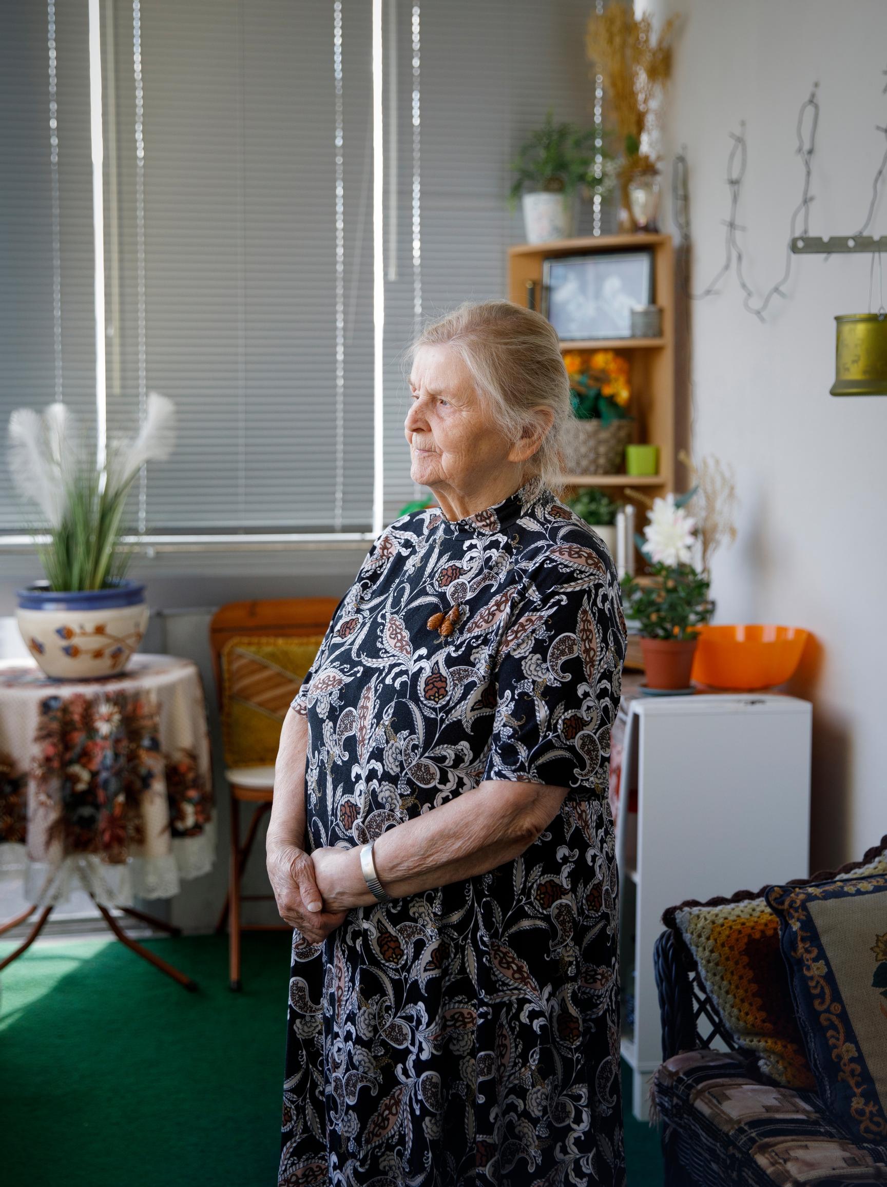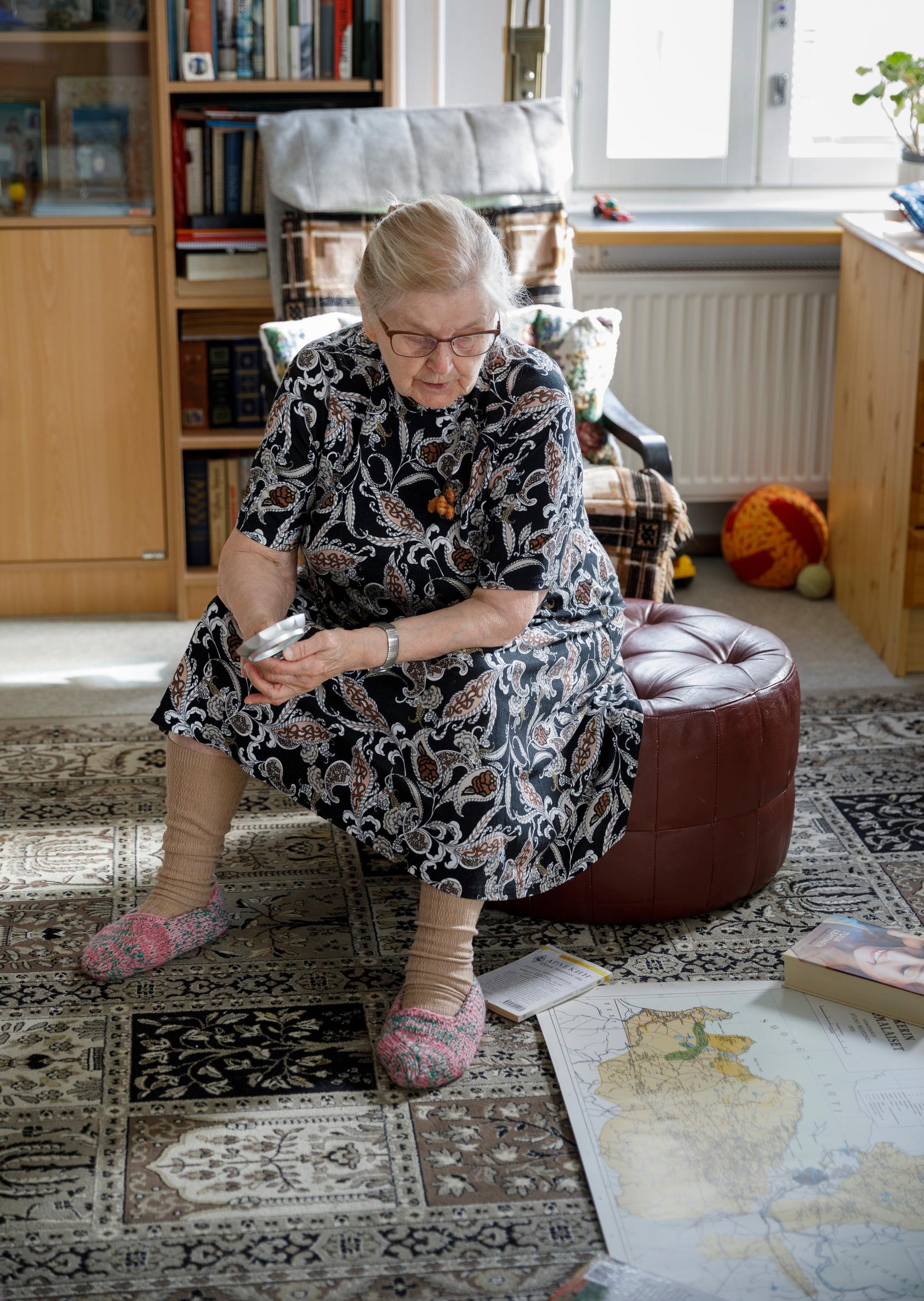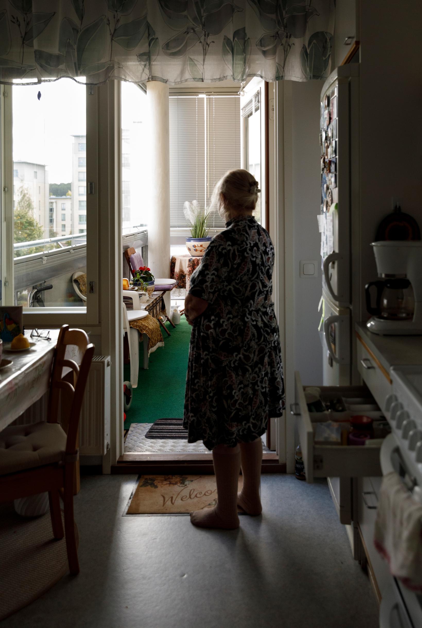 Anna-Maria Orgolainen, 86, avaa oven senioritalossa Kaukajärvellä Pirkanmaalla. Halaus on lämmin ja suomen kieli pehmeän erilainen. Pienikokoisen naisen silmät tuikkivat, kun hän kaataa vierailleen sitruunalla maustettua mus- taa vahvaa teetä. Tarjolla on myös pihalta poimittuja syysomenoita, leipää, voita ja meetwurstia. Tänään on keskiviikko, saunapäivä, jolloin talon asukkaat saavat käydä löylyissä yksin tai yhdessä.