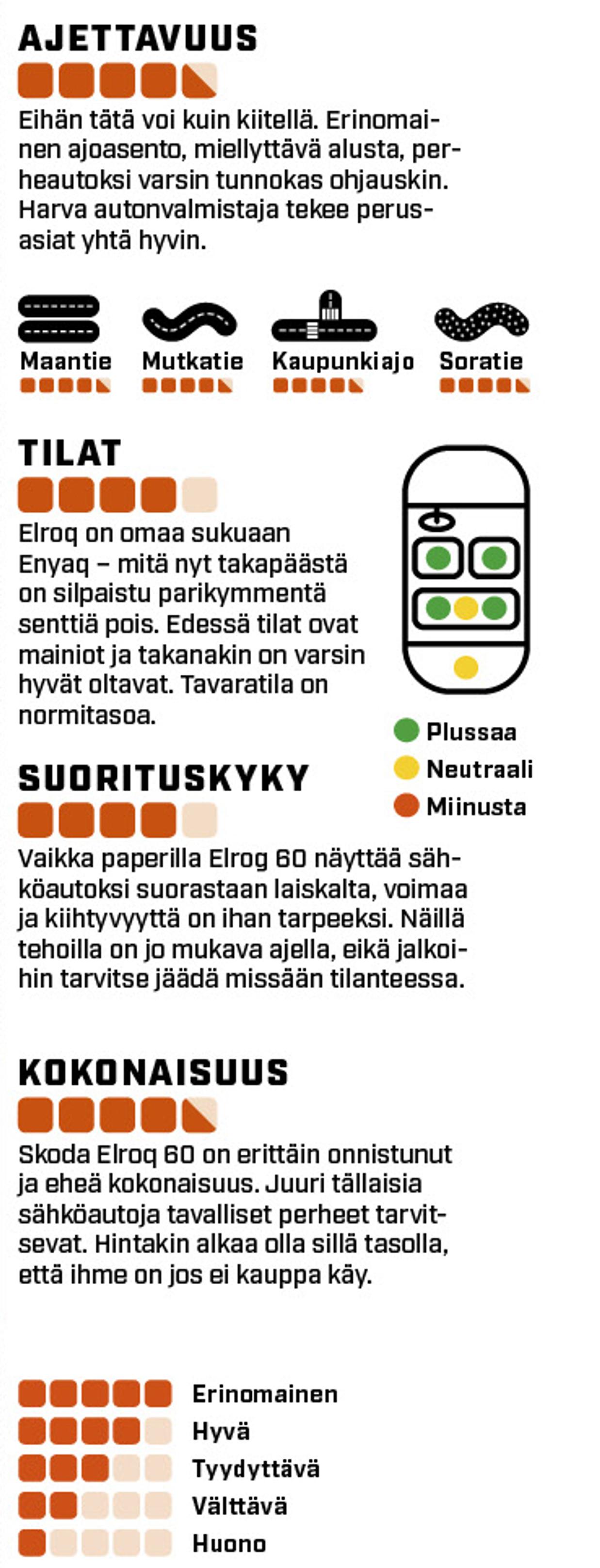 Elroq 60:n akun nettokapasiteetti on 59 kWh. Hintaeroa Elroq 50:een (52 kWh) tulee samoilla varusteilla 3 000 euroa; toisaalta isompiakkuinen Elroq 85 (77 kWh) Style-versiona maksaa sitten jo viisi tonnia enemmän. Omaa ajoprofiiliaan kannattaakin miettiä ja puntaroida ennen ostopäätöstä ettei tule maksettua turhasta.