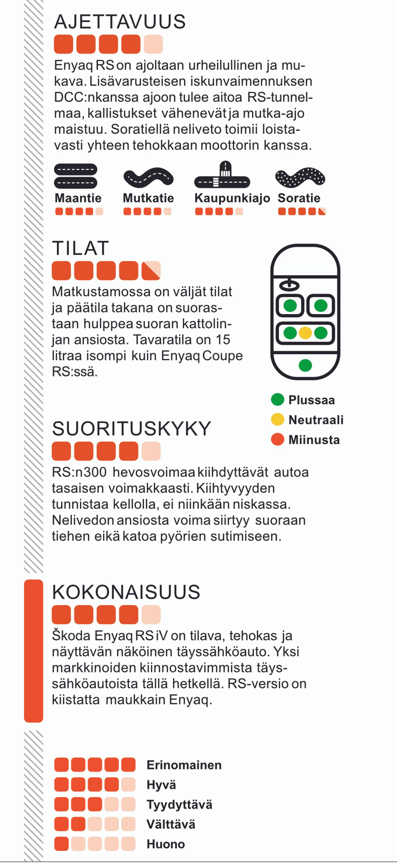 Enyaq RS pitää sisällään kaksi eri autoa. Sen tilankäyttö ja järkevyys sopivat hyvin lapsiperheelle, mutta RS tyydyttää myös urheilullisesta autosta pitävän autonostajan tarpeet.