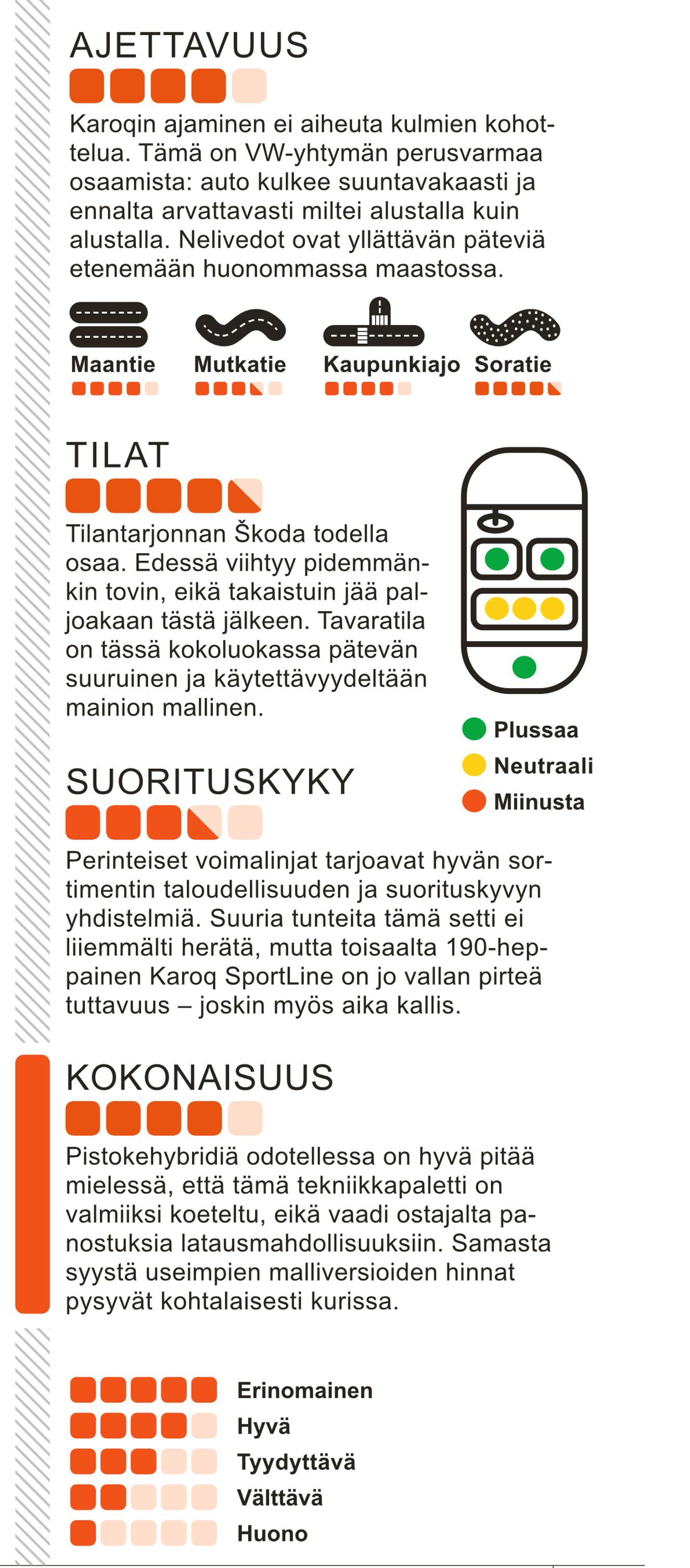 Karoq on ajo-ominaisuuksiltaan edelleen perusvarma tuttavuus. Matka-ajossa auto etenee vakaasti ja junamaisella leppoisuudella. Ohjaustuntuma on hyvä, ja jo 150-heppaisessa bensiini-Evossa riittää voimaa sen verran hyvin, että ajaminen tuntuu kevyeltä. Sisämelutaso pysyy ainakin sileällä asvaltilla hyvin kurissa. Ensimmäiset autot ovat juuri saapuneet Suomeen.