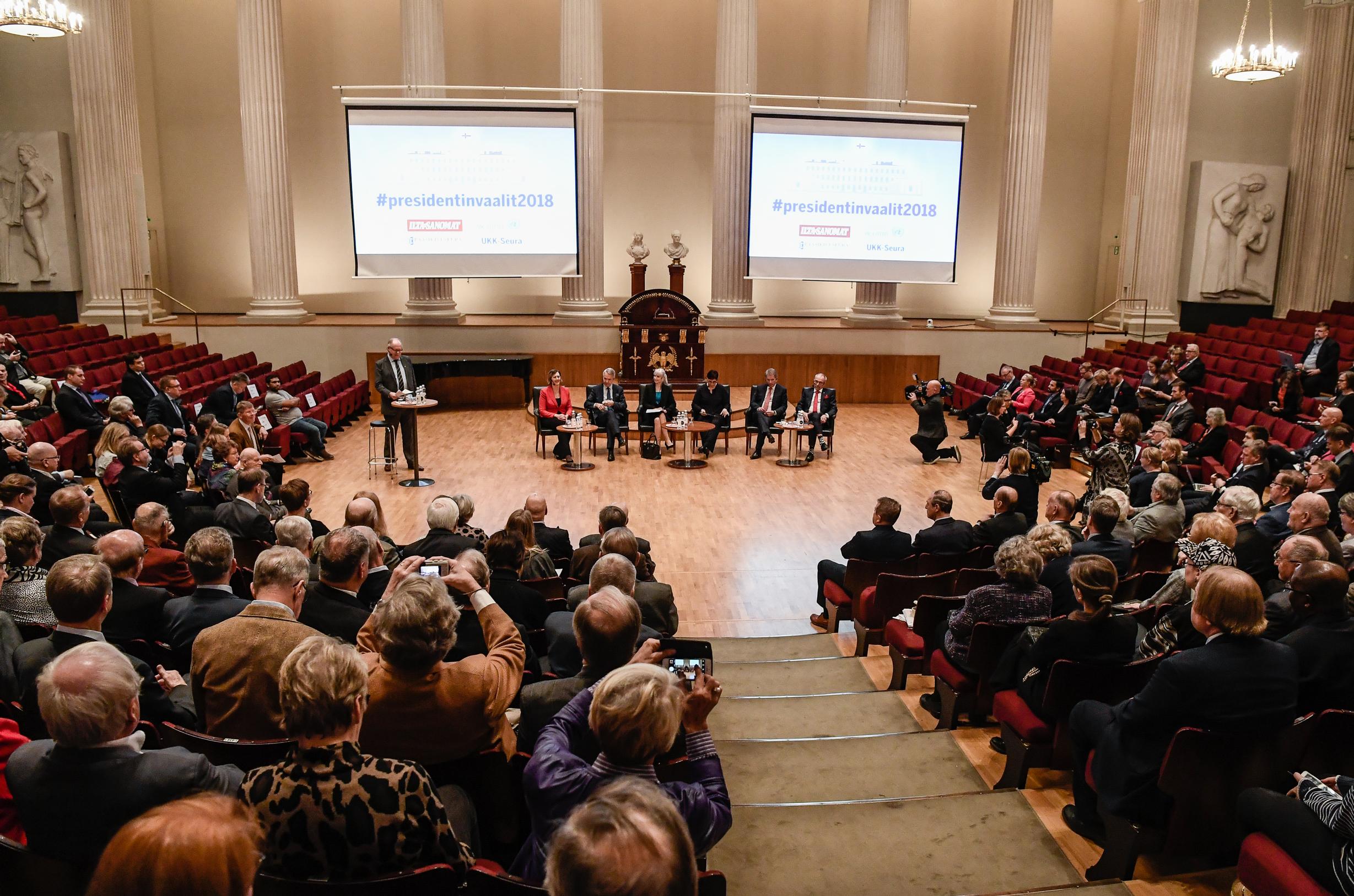 On yleisössä sentään joku hereilläkin. Laura Huhtasaaren puhelin on tuolilla hänen vieressään. Parvelta näkee, kuinka sen näyttöön syttyy jatkuvasti valo, mitä seuraa kurkkaus ruutuun ja käännähdys katsomoon. Mitä todennäköisimmin perussuomalaisehdokasta kauko-ohjaa hänelle kampanjaa tekevä puoluelehti Suomen uutisten päätoimittaja Matias Turkkila, jonka poolokaulukset ovat poikkeus yliopiston aulaan tentin jälkeen purkautuvassa ikä- ja pukumiesten virrassa.