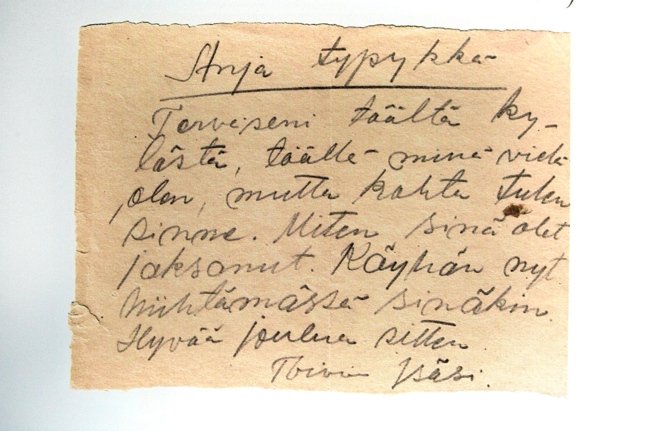Rintamalta alkoi tulla kirjeitä, joissa paistoi isän rakkaus ja huoli: ”Rakas kulta eukkoni…Kirjoitan täältä taas ikävissäni ja huolissani… Koita kestää urhoollisesti ja kyllähän sinä kestät. Rakkaani, kun pääsen pois, niin sitten minä koitan maksaa sinulle kaikki kärsimykset…”