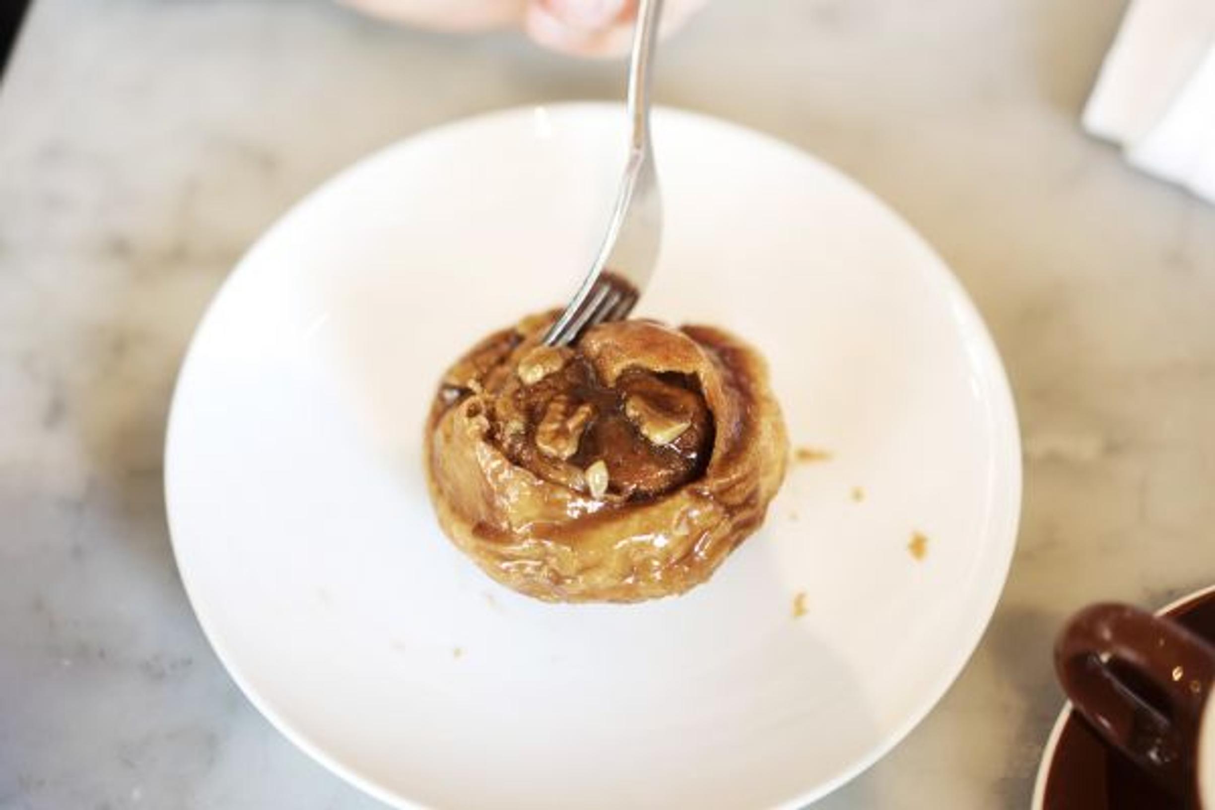 Onneksi ruoka on hyvää. Kia on parkkiruudussa ja edessä Milo & Olive -ravintolan trendikkään minimalistinen sisustus; puuta, betonia, nurkassa puu-uuni. Kauppi bongaa vitriinistä heti pienet siirappiset sticky bun -pullat. Ruoka on Kaupin intohimo.