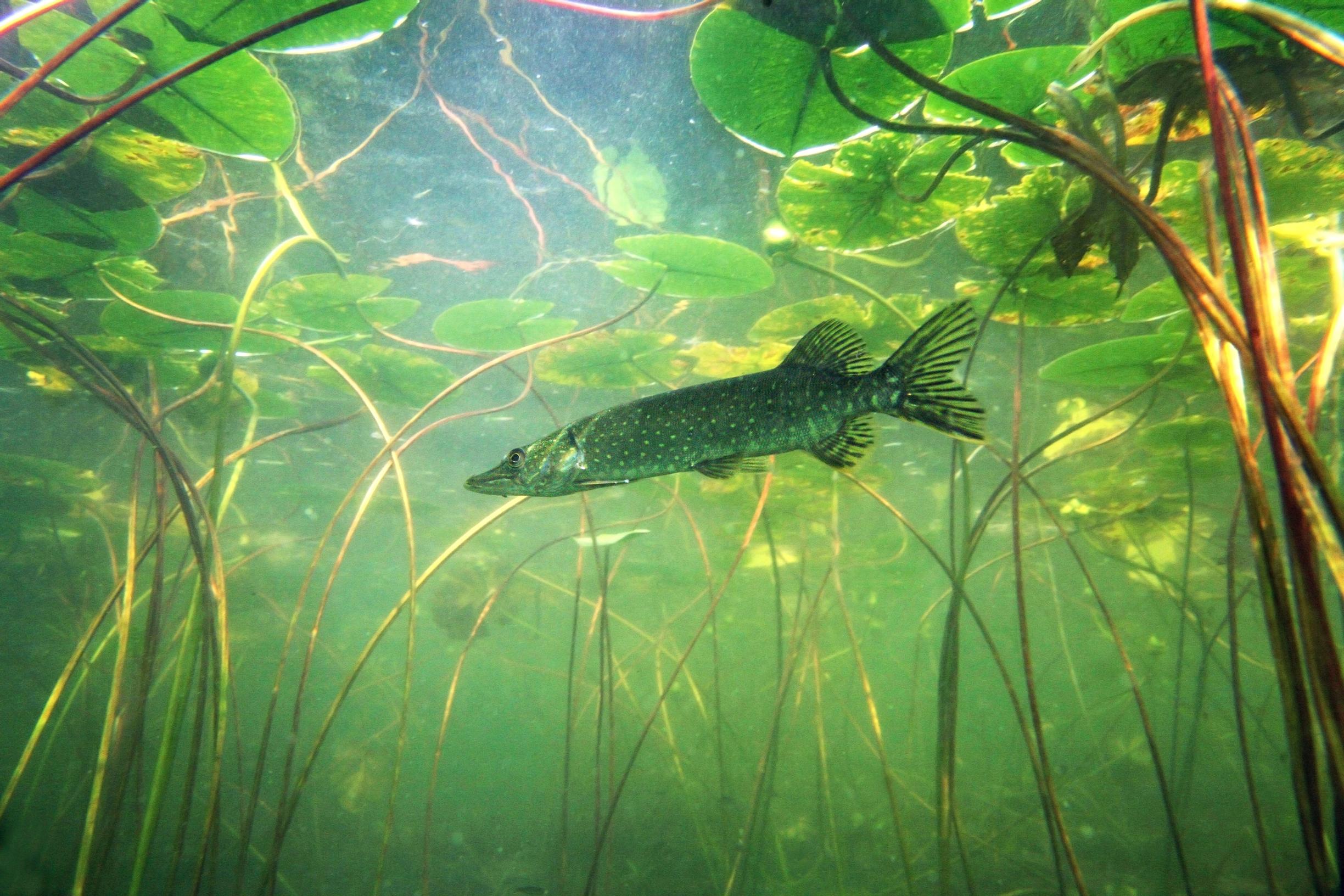 Pääkuvassa: Hauki väijyy saalista Tampereen Kaukajärvellä uimarannan tuntumassa.