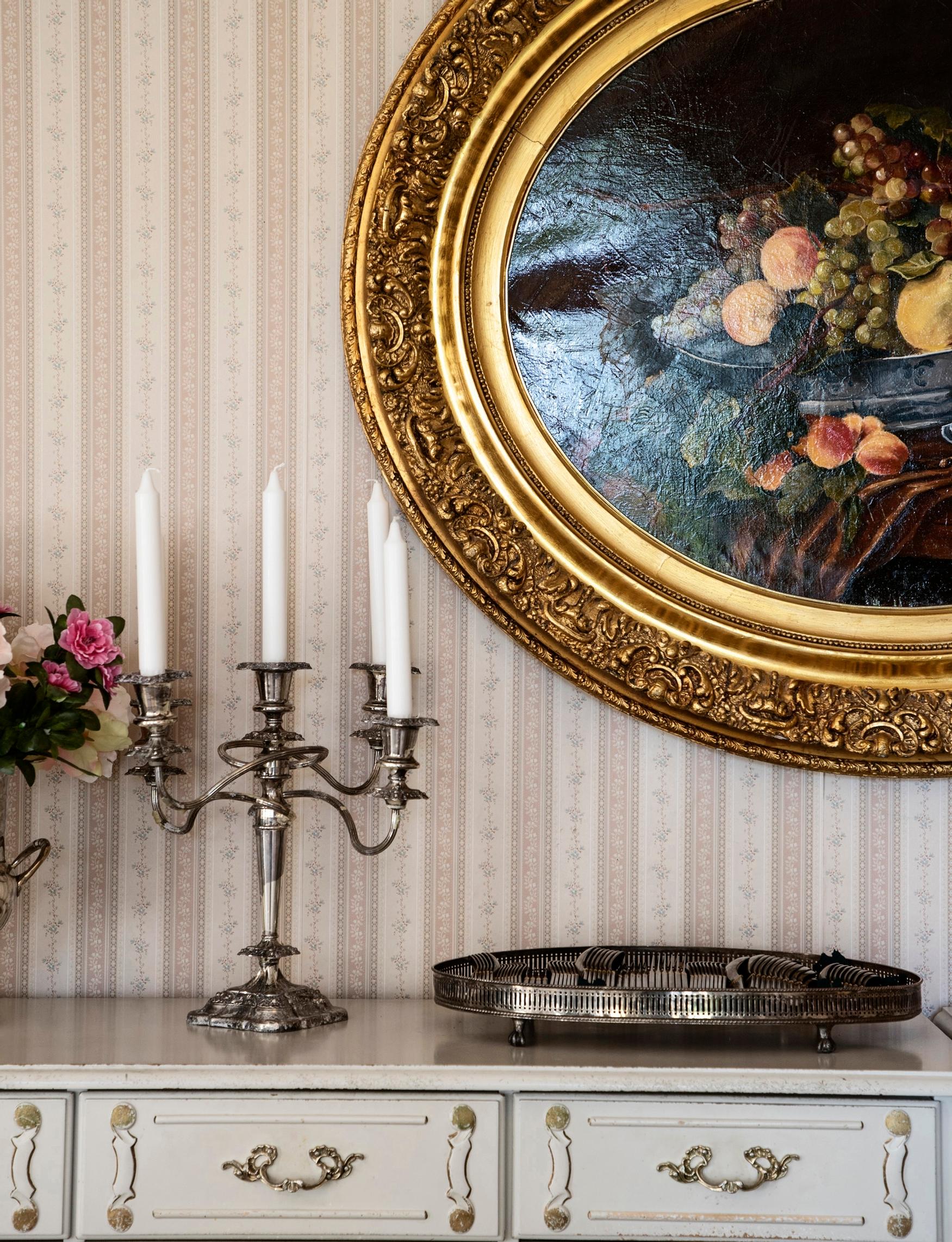 Nyt salin seinällä komeilevat isoissa maalauksissa Venäjän keisarinna Katariina II Suuri ja Ruotsin kuningas Kustaa III. Kalustus on Kustaan mukaan nimettyä kustavilaista, ja lipastoissa on tyylisuuntaan kuuluvat sirosti pullistelevat muodot.