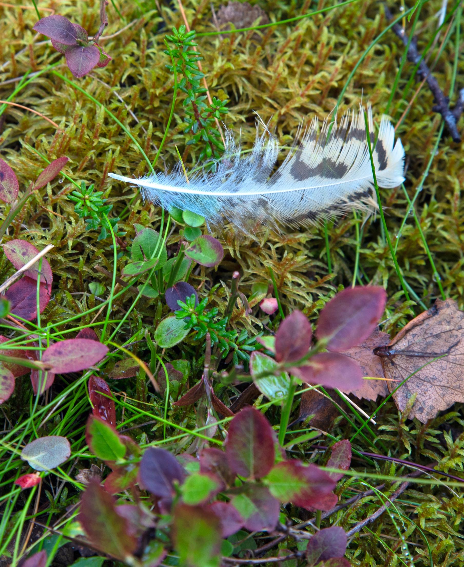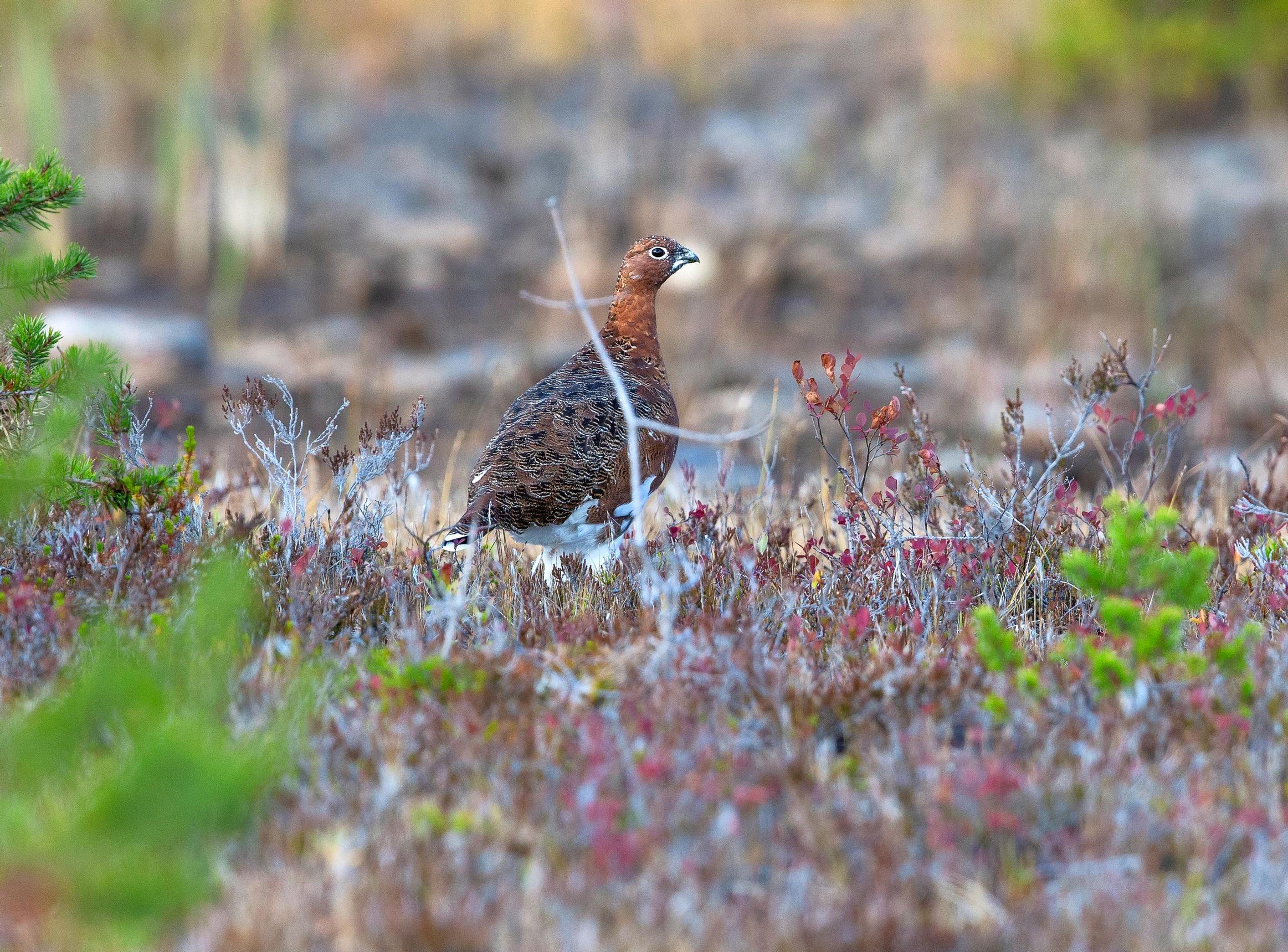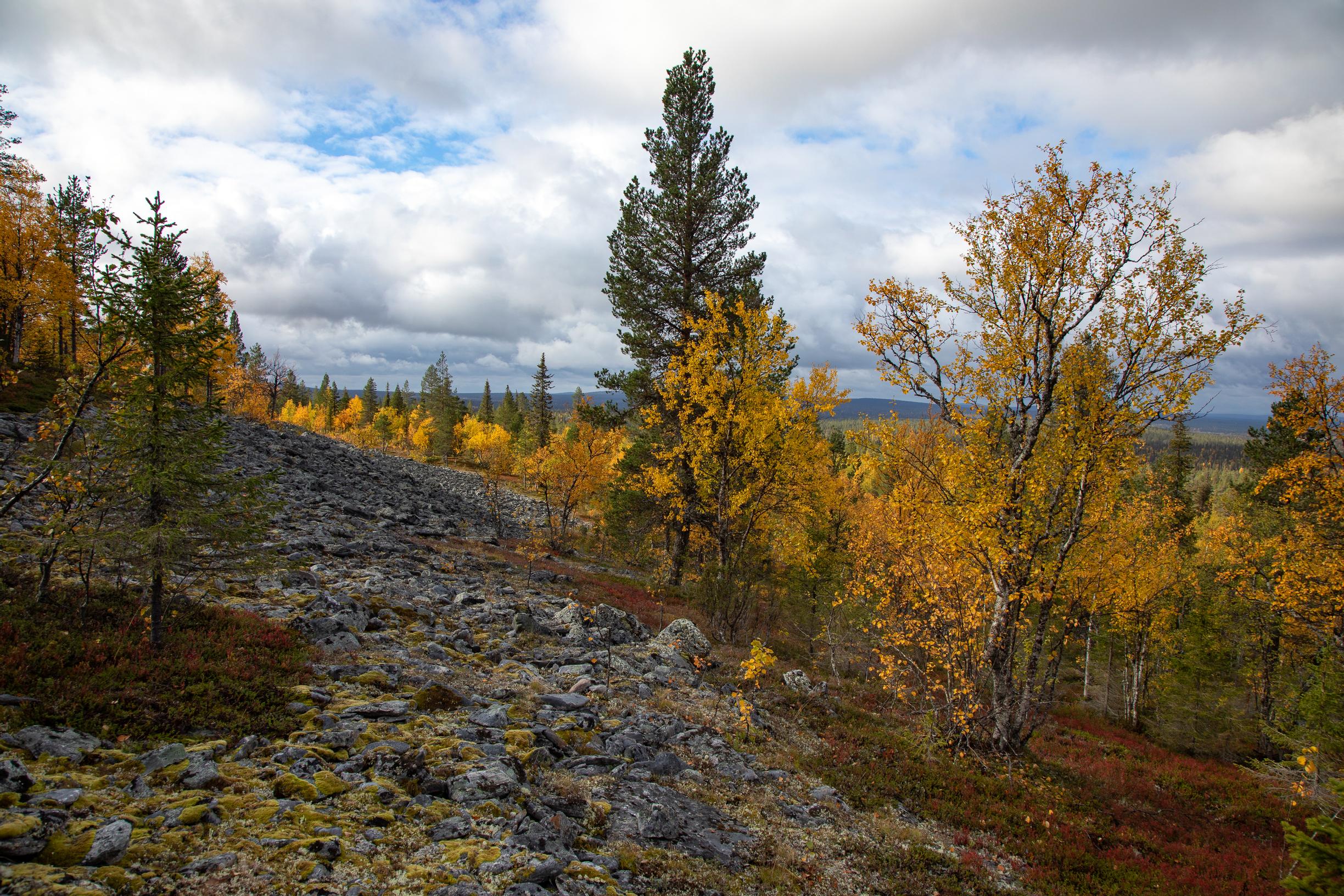 Yhtäkkiä edestäni kuuluu voimakas humahdus, ja näen kolmen riekon säntäävän lentoon. Ne ovat ruokailleet variksenmarjoilla tunturikoivujen juurella ja maastoutuneet naamiopukunsa ansiosta varvikkoon. Tänä vuonna marjasato on ollut erinomainen, joten metsän asukeilla on runsaat ravintoapajat, joista tankata talvea varten. Merkitsen kolmikon sijainnin karttaan ja otan paikasta kuvan GPS-paikannusta varten.