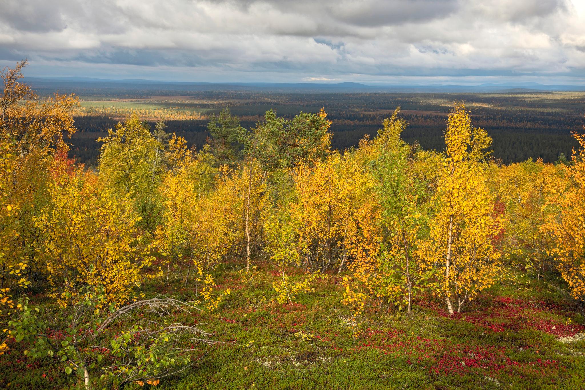 Suuntaan kohti Värriötunturi ykköstä aseman lähellä. Maa hehkuu punertavana, tunturikoivujen keltaiset lehdet havisevat.