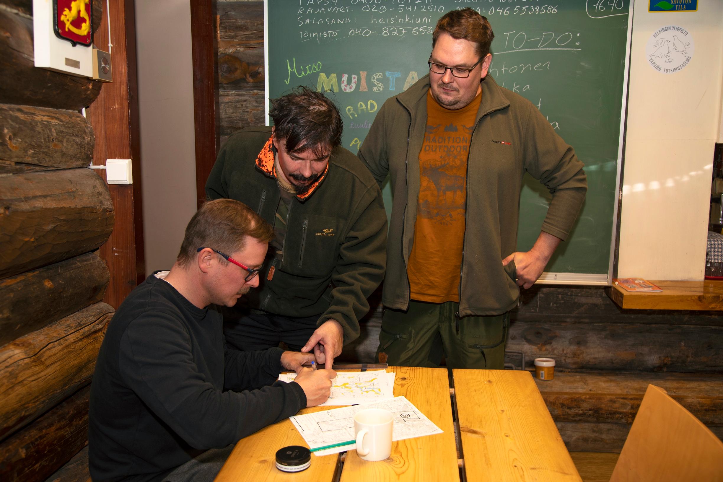 Lounaaseen mennessä työt SMEARilla on saatu hoidettua, sitten onkin seuraavan tutkimuslinjan vuoro. Takkahuoneen pöydän äärellä Kimmo Neitola, Jukka Kärki ja luonnonpuiston metsän kuin omat taskunsa tunteva Tarmo Kylli piirtävät A4-kokoisille kartoille koukeroisia viivoja.