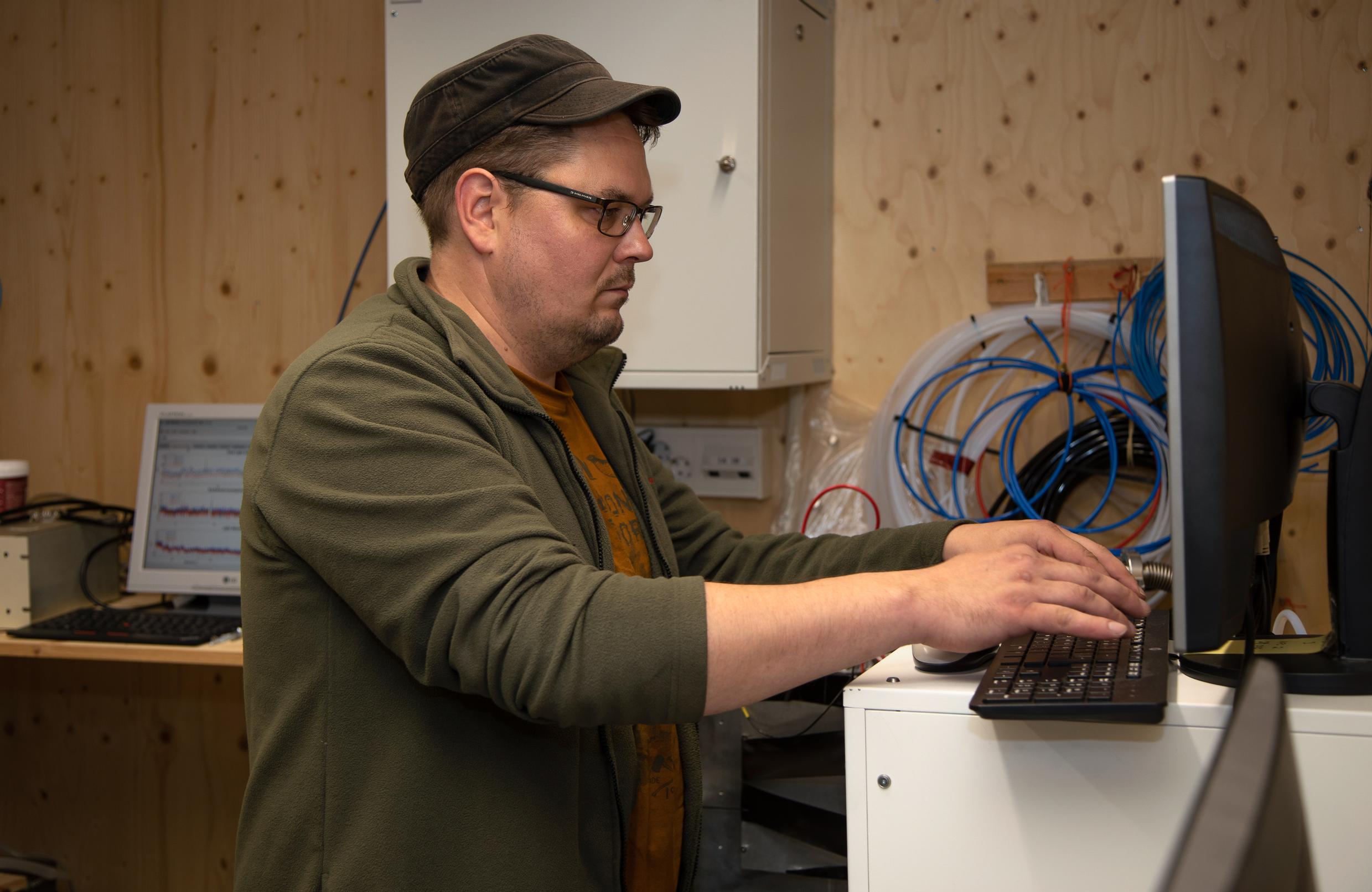 SMEAR-mittausaseman toisessa valvontahuoneessa kesätyöntekijä Jukka Kärki toistaa päivittäisiä rutiinejaan.