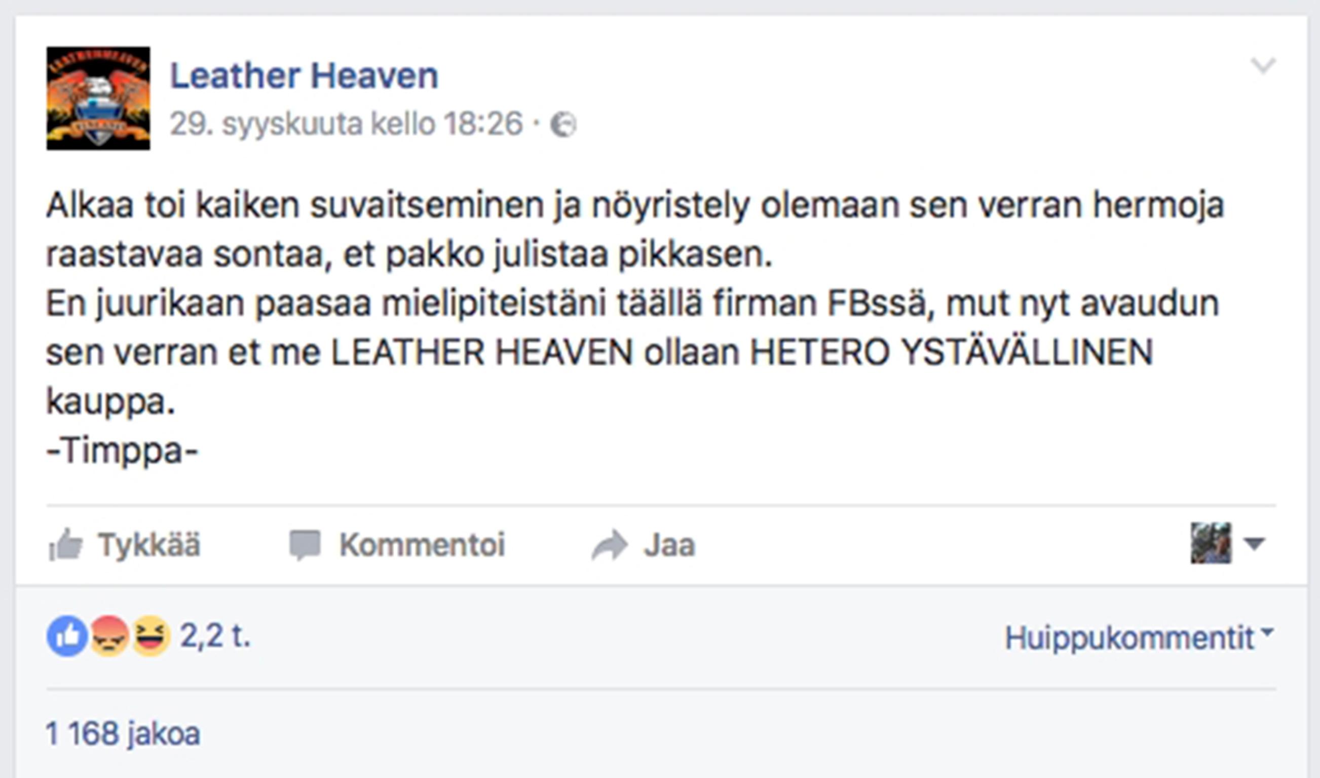 Somerolainen Leather Heaven -liike aiheutti sosiaalisessa mediassa raivoisan kohun ilmoittamalla viime viikon torstaina Facebookissa, että suvaitseminen ja nöyristely on hermoja raastavaa sontaa. Leather Heaven jatkoi korostamalla, että yritys on heteroystävällinen. Yritys ilmoitti vielä viestiketjun kommenttikentässä, että kun joku päätti lähettää sateenkaarilipun avaruuteen, heidän ”nurkissa ei sateenkaaret rehota”.