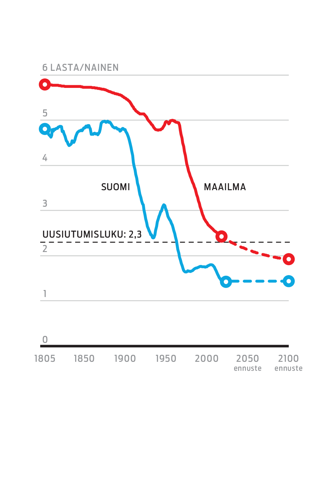 Syntyvyys on laskenut selvästi väestön uusiutumistason alapuolelle. Niin sanottu luonnollinen väestönkasvu on jo negatiivista: ihmisiä kuolee enemmän kuin syntyy. Väestö kasvaa edelleen positiivisen nettosiirtolaisuuden ansiosta. Suomeen siis muuttaa enemmän ihmisiä ulkomailta kuin täältä pois.
