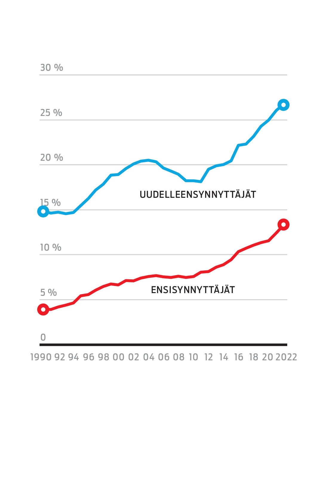 Syntyvyys on vajonnut kolmanneksella 13 vuodessa. Se on valtava pudotus. 35-vuotiaista miehistä puolet on lapsettomia, naisistakin 35 prosenttia. Ylipäätään melkein kaikissa ikä- ja koulutustasoryhmissä syntyvyys on laskenut.